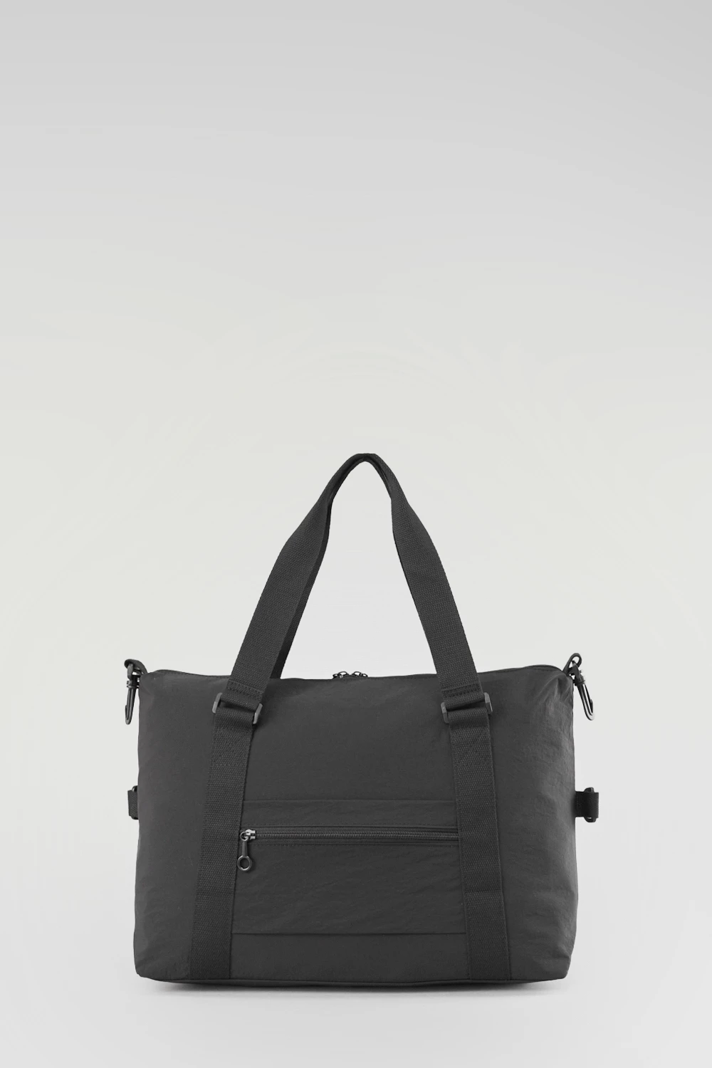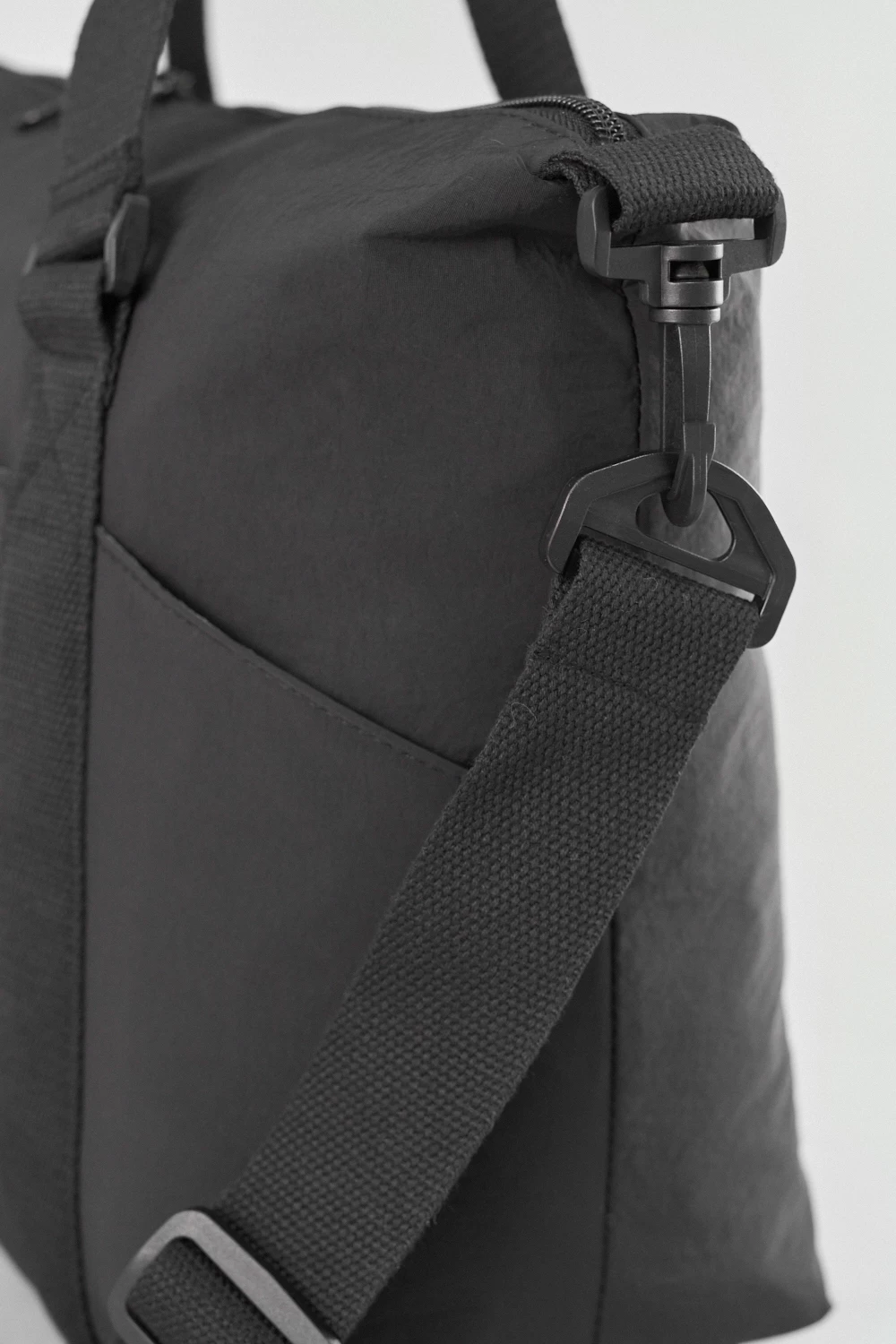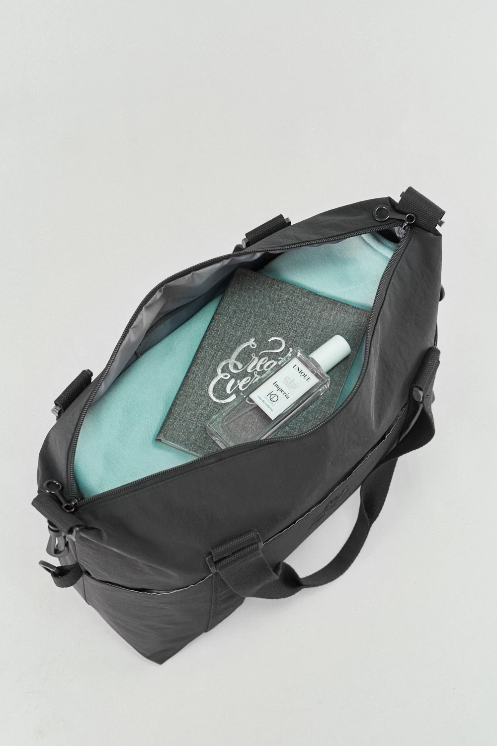 Черная дорожная сумка с отделением и внутренним карманом на молнии. Снаружи предусмотрены открытый карман и карман на молнии для удобства доступа к вещам. В комплекте - надежный текстильный ремень. Функциональный и стильный вариант для путешествий и повседневной носки.