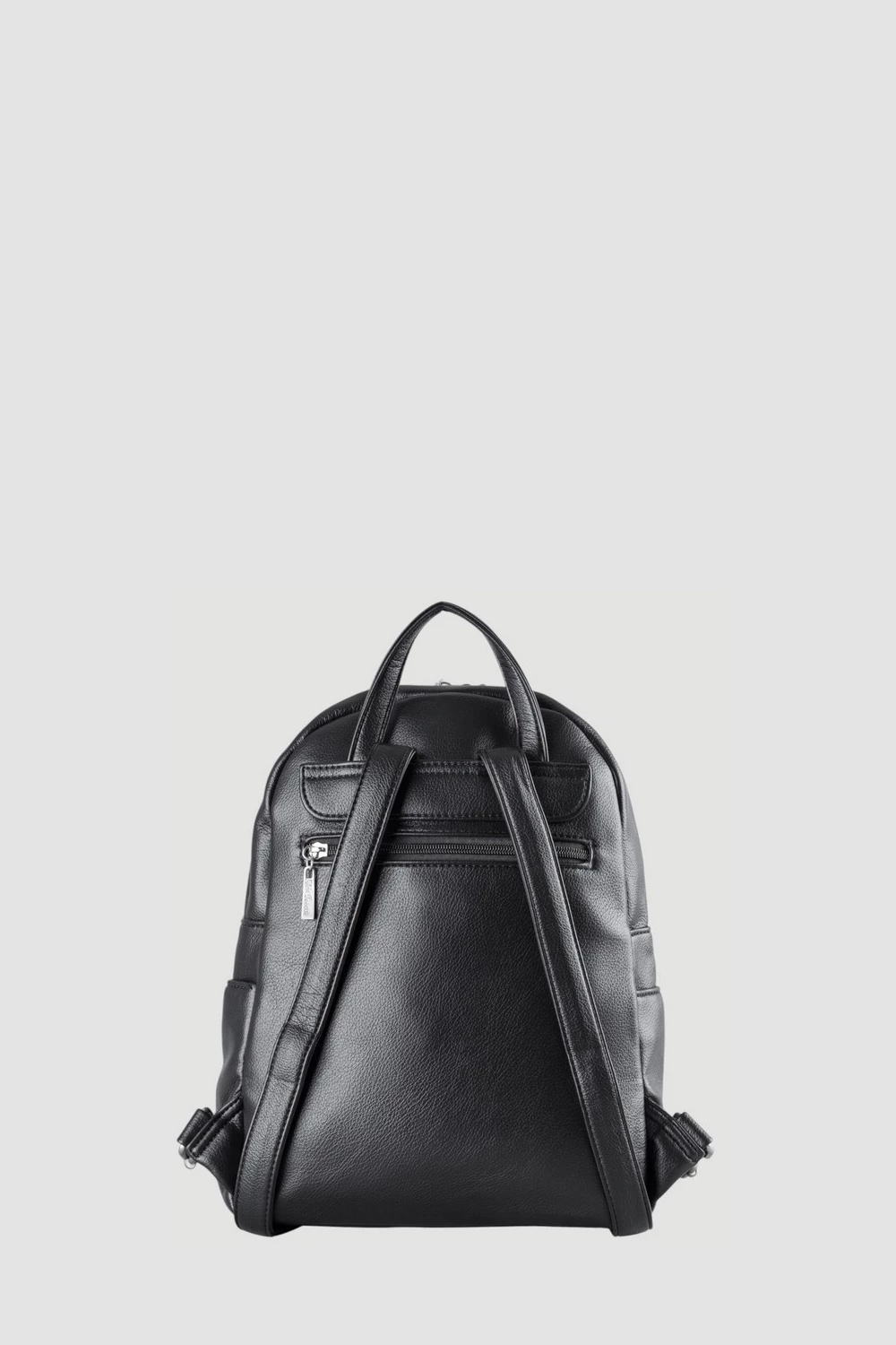 Черная сумка-рюкзак из экокожи — функциональный аксессуар для повседневного использования. Модель оснащена одним отделением на надежном замке, двумя боковыми открытыми карманами и дополнительным вместительным карманом на молнии впереди.Внимание уделено безопасности вещей владельца благодаря скрытому потайному карману на спинке изделия. Элегантный черный оттенок экокожи подчеркнет индивидуальность стиля и гармонично дополнит образ.