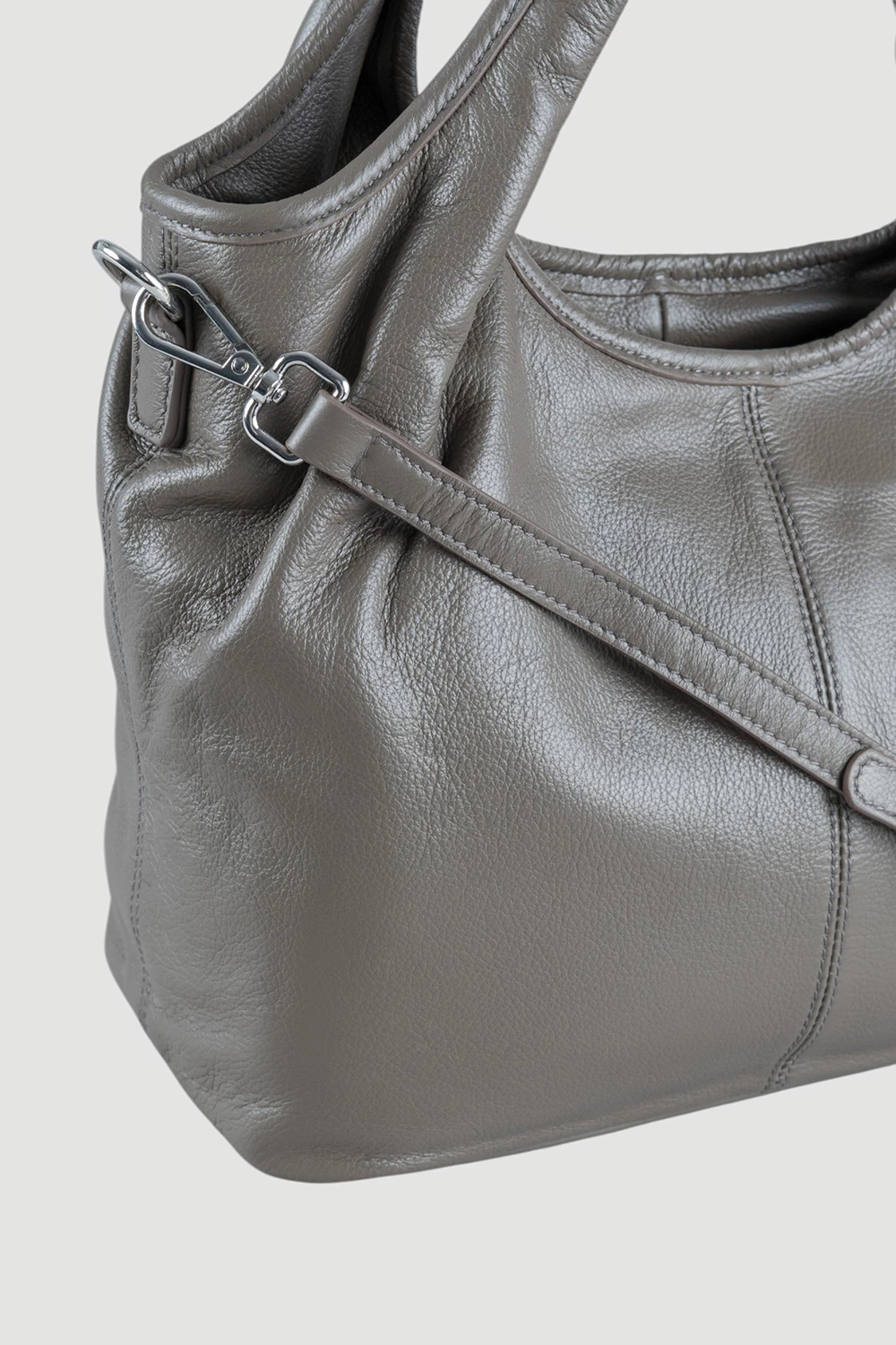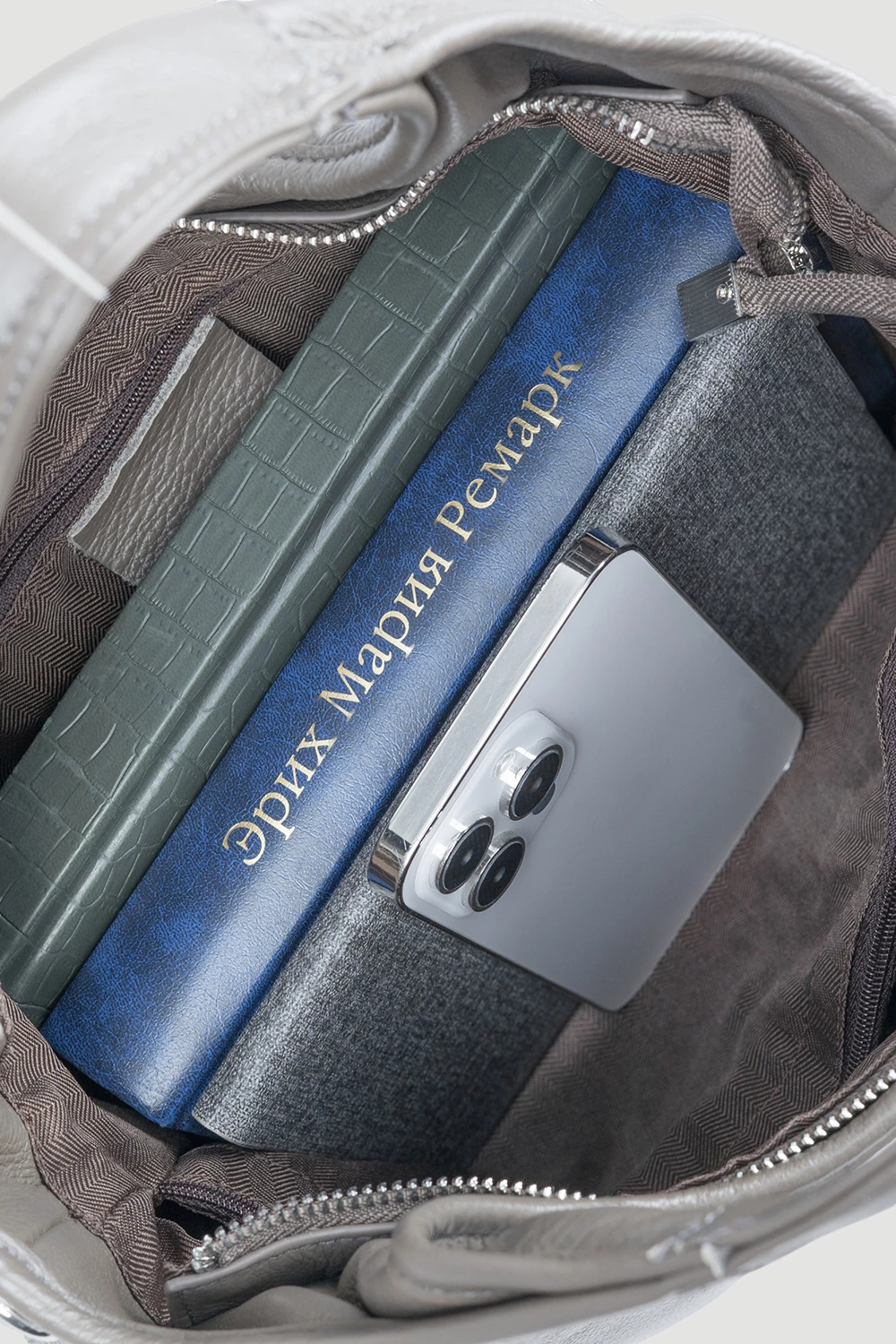 Женская сумка-мешок в бежево-сером оттенке. Лаконичный дизайн и универсальный цвет помогут сочетать сумочку с различными образами. Вместительность и удобство этого аксессуара станут большим плюсом в решении повседневных дел.● в комплекте имеется регулируемый ремень