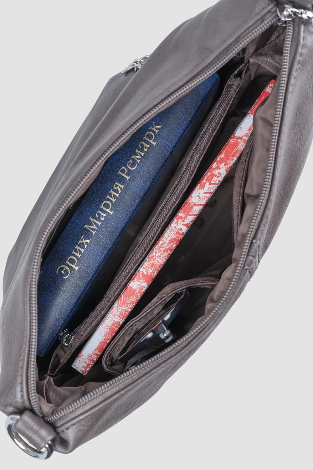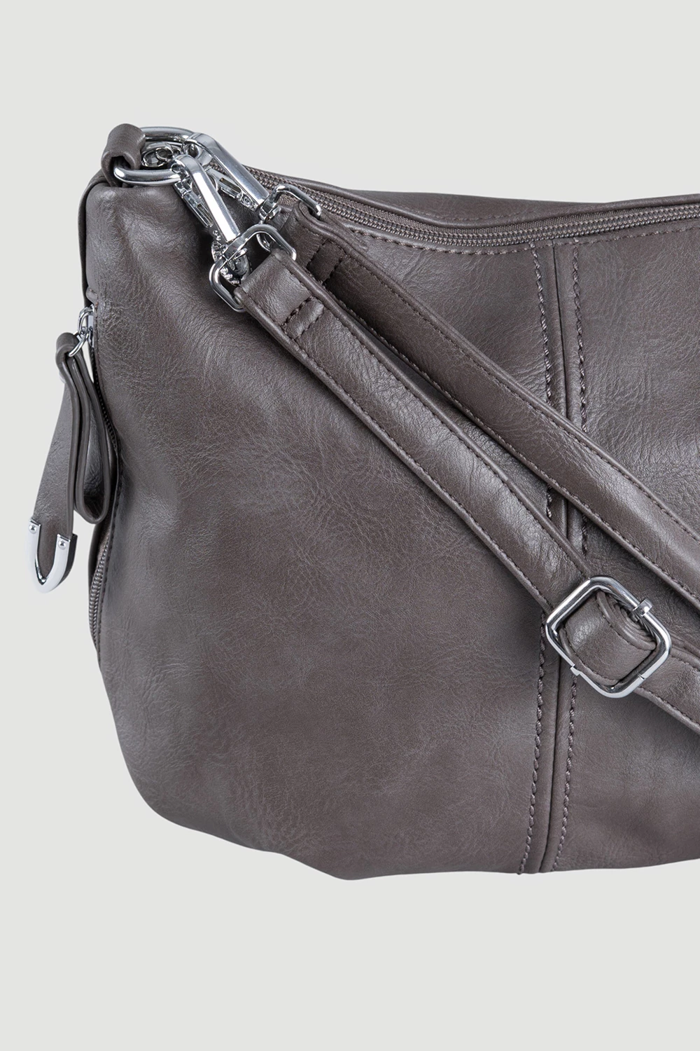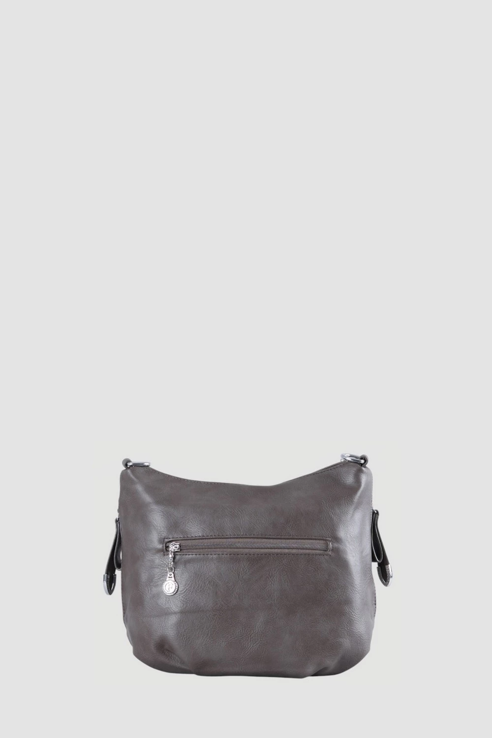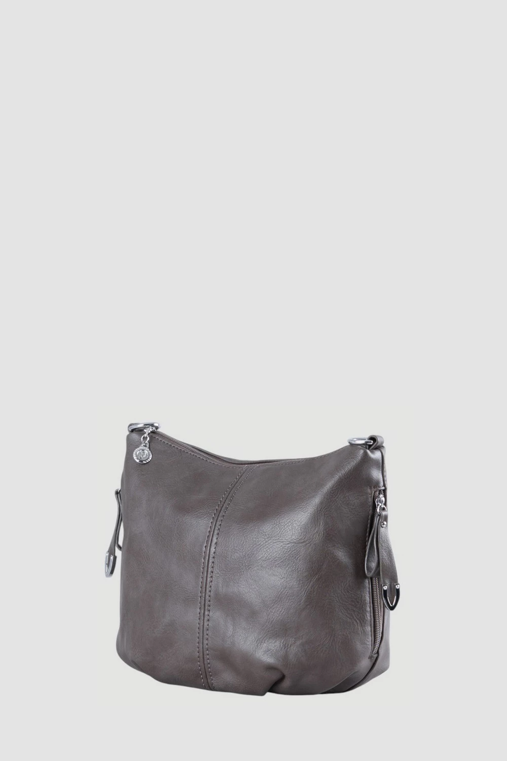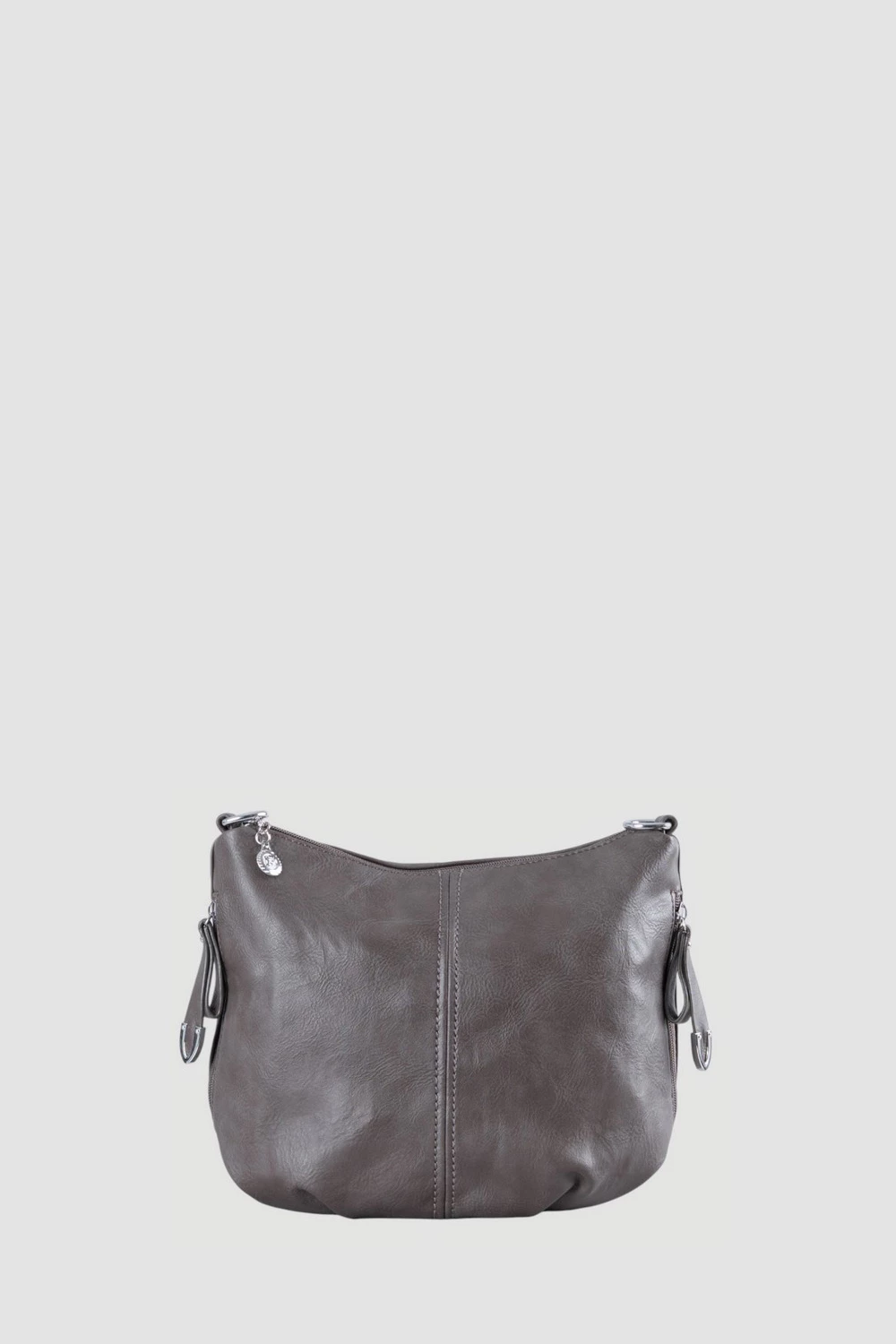 Серая сумка-мешок с двумя внутренними отделениями, разделенными карманом на молнии, дополнительно оснащена двумя открытыми и одним закрытым карманом.Комплектуется длинными и короткими регулируемыми ремнями. Имеет внешние боковые карманы на молнии и скрытый задний карманчик для мелочей.