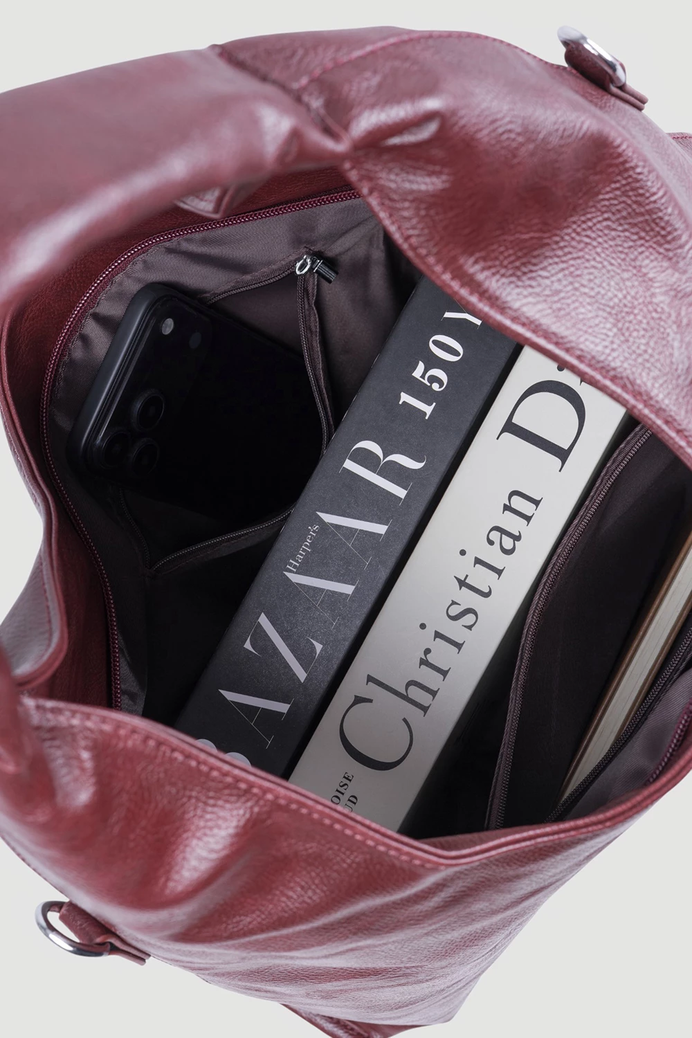 Красная сумка-мешок из экокожи - смелый акцент для образа. Модель с универсальным съемным ремнем и верхней ручкой. Сзади - кармана на молнии для организации мелочей.Вместительное основное отделение подходит для повседневного использования. Внутри предусмотрено два кармана: один на молнии и один открытый для доступа к часто используемым предметам.