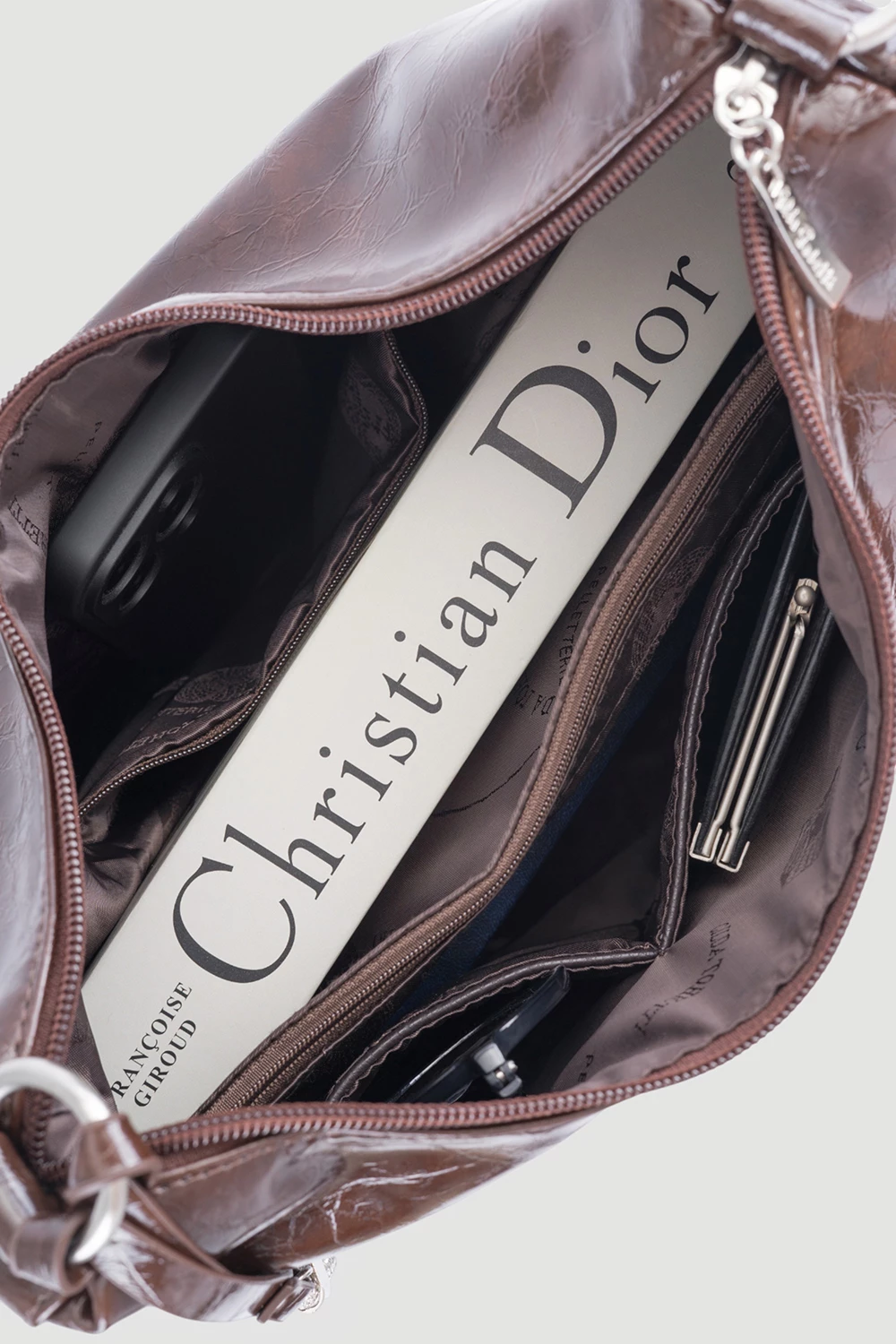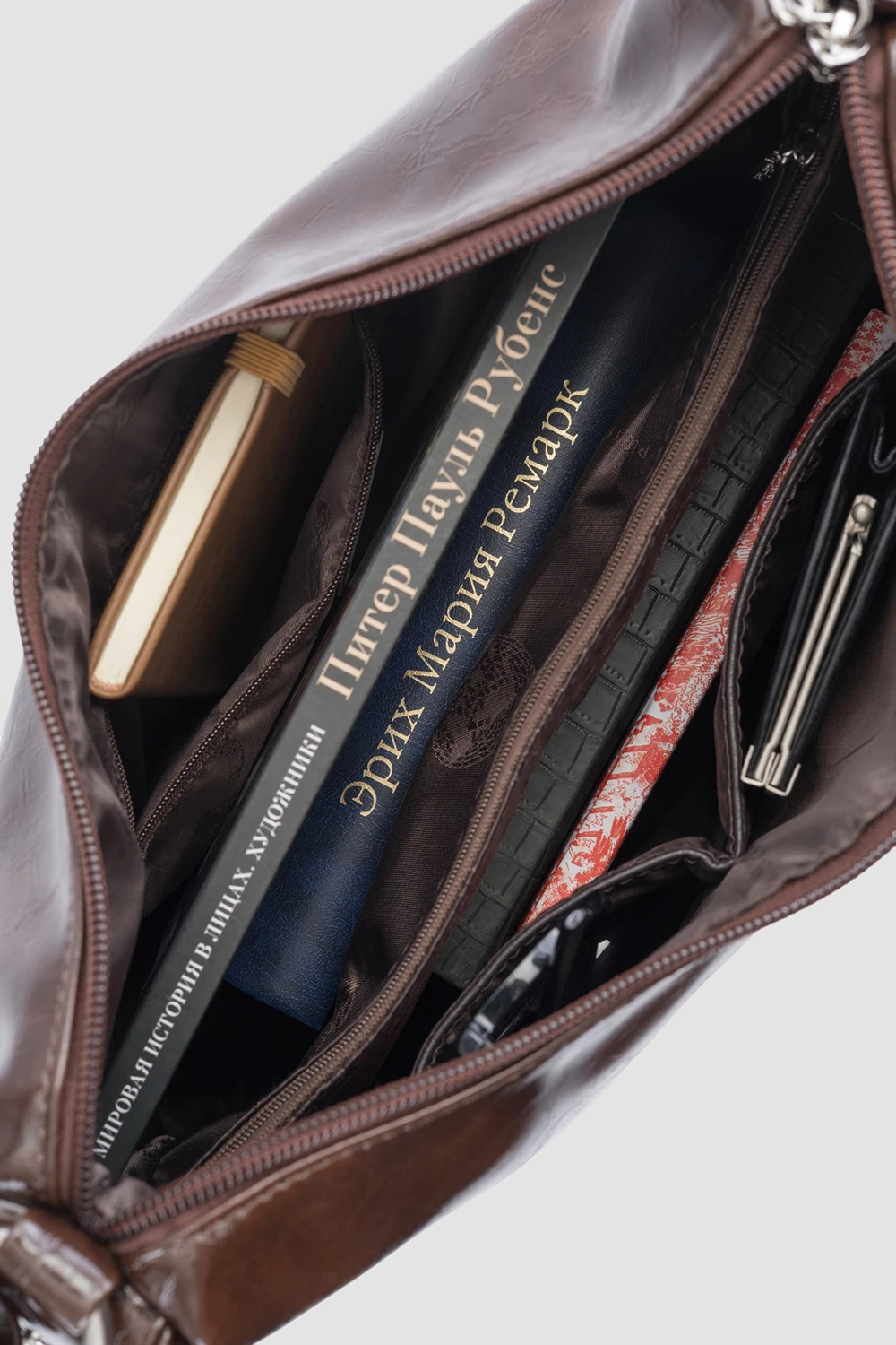 Сумка-мешок коричневого цвета выполнена из экокожи. Внутри два отделения, разделённые карманом на молнии, также имеются дополнительный внутренний карман на молнии и два открытых кармана.Снаружи предусмотрен задний карман на молнии. В комплект входят длинный и короткий ремни. Подходит для повседневных прогулок, выездов на природу, занятий спортом и путешествий.