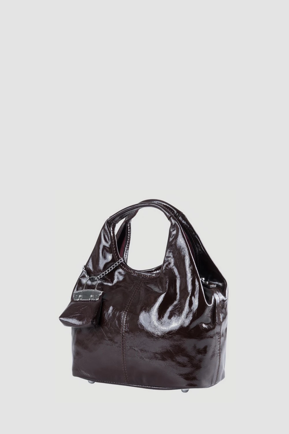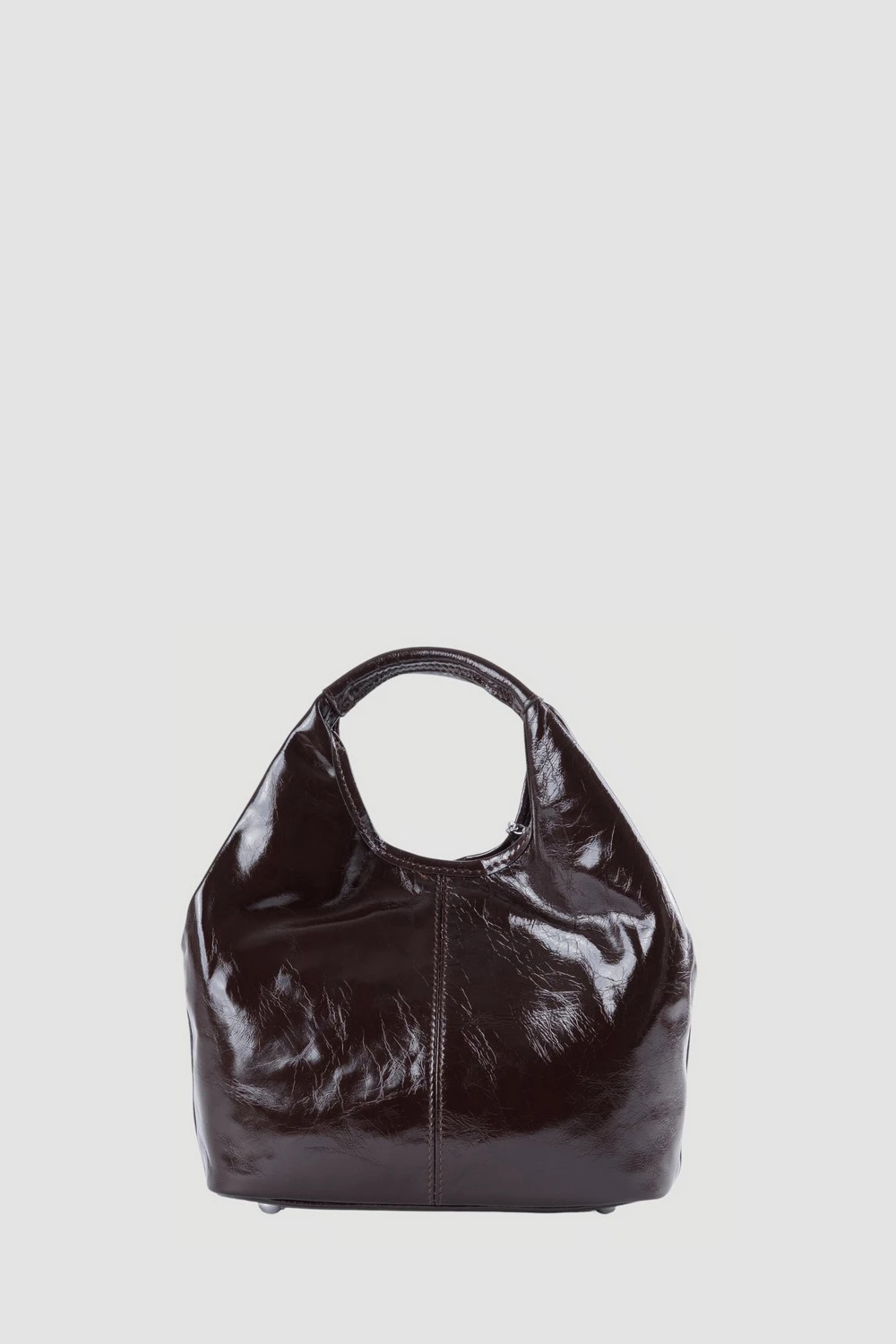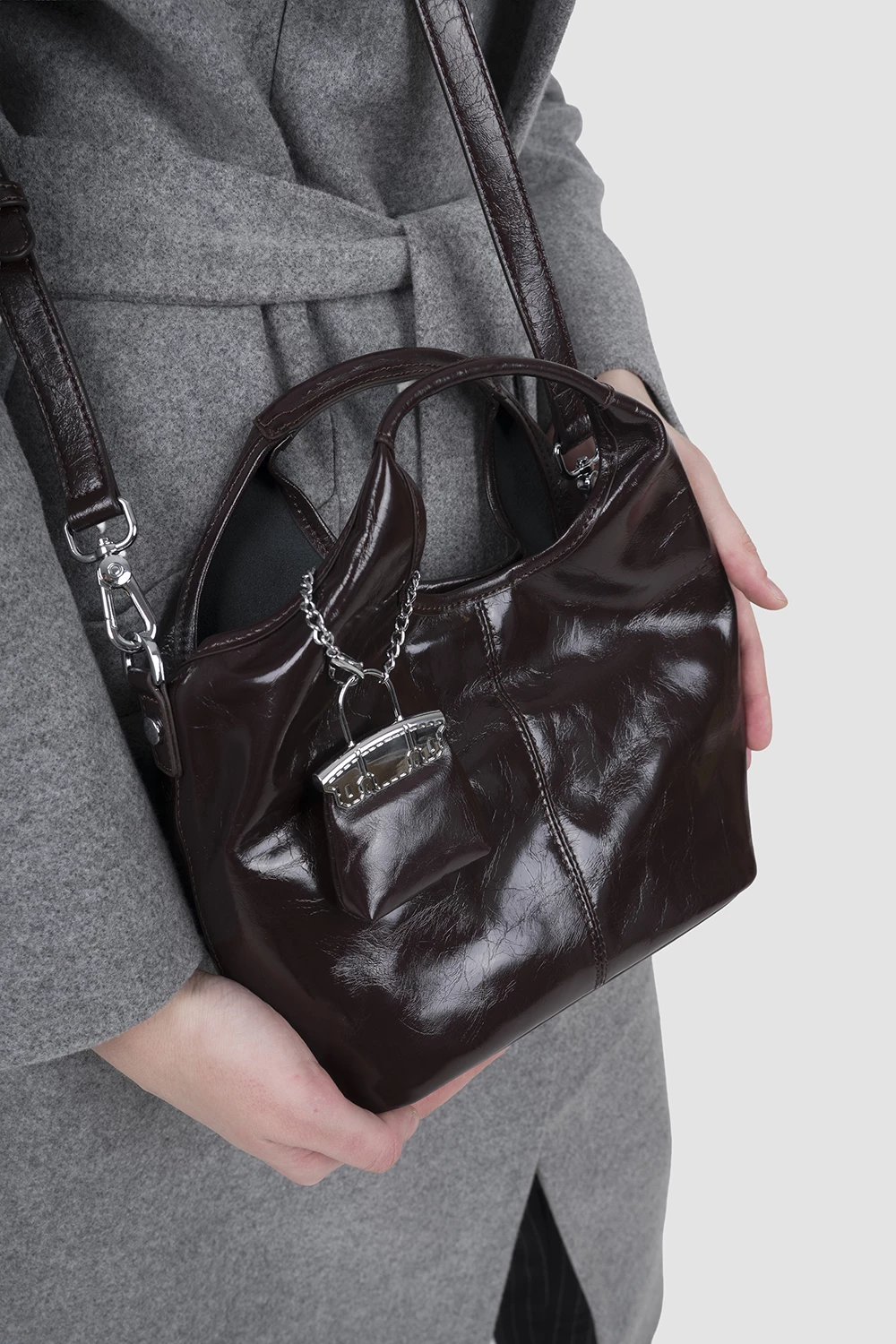 Коричневая сумка-мешок с тремя секциями внутри, оснащенная открытым и защищенным закрытым карманом. Поставляется вместе с регулируемым длинным ремнем и оригинальным брелком. Универсальная и комфортная, подчеркнет индивидуальность каждого образа.● 4 металлических ножки на дне