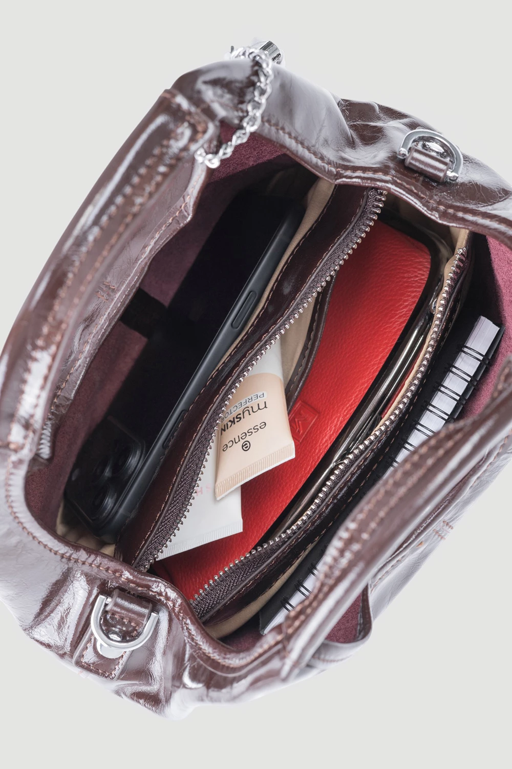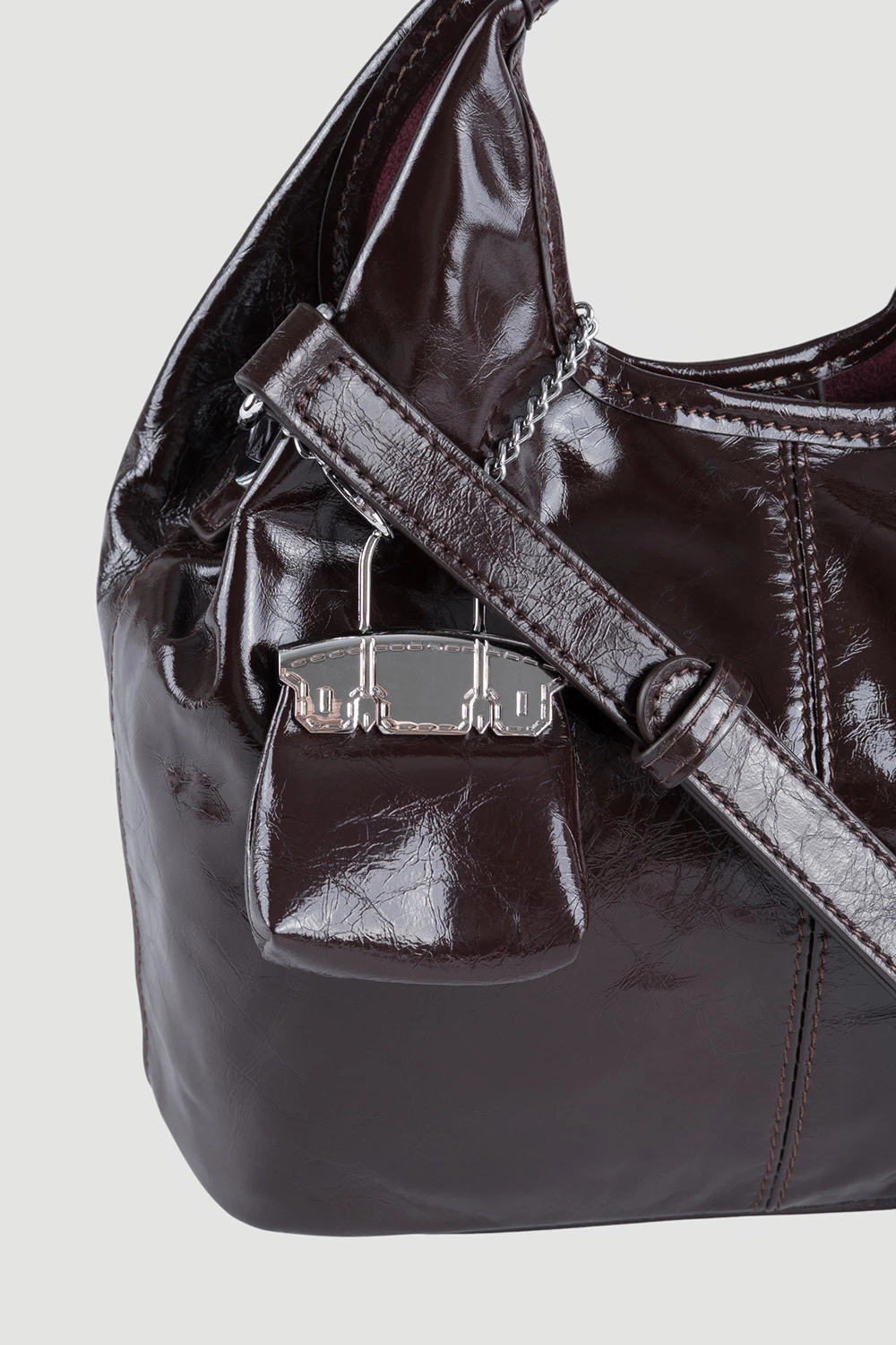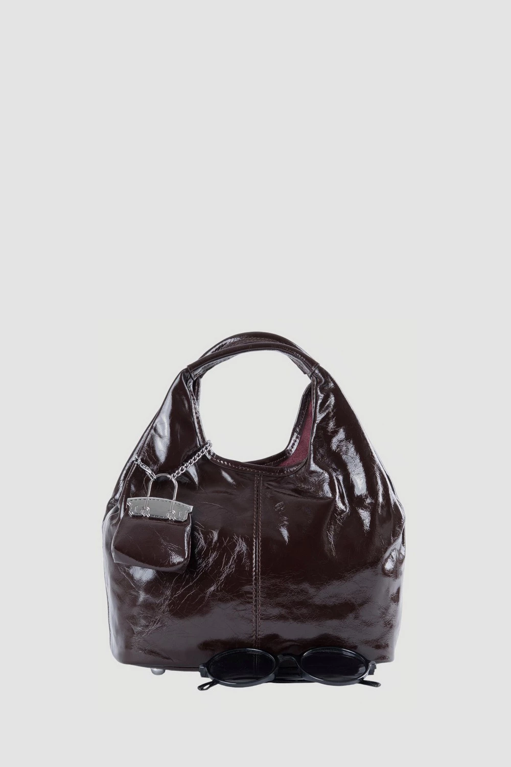 Коричневая сумка-мешок с тремя секциями внутри, оснащенная открытым и защищенным закрытым карманом. Поставляется вместе с регулируемым длинным ремнем и оригинальным брелком. Универсальная и комфортная, подчеркнет индивидуальность каждого образа.● 4 металлических ножки на дне