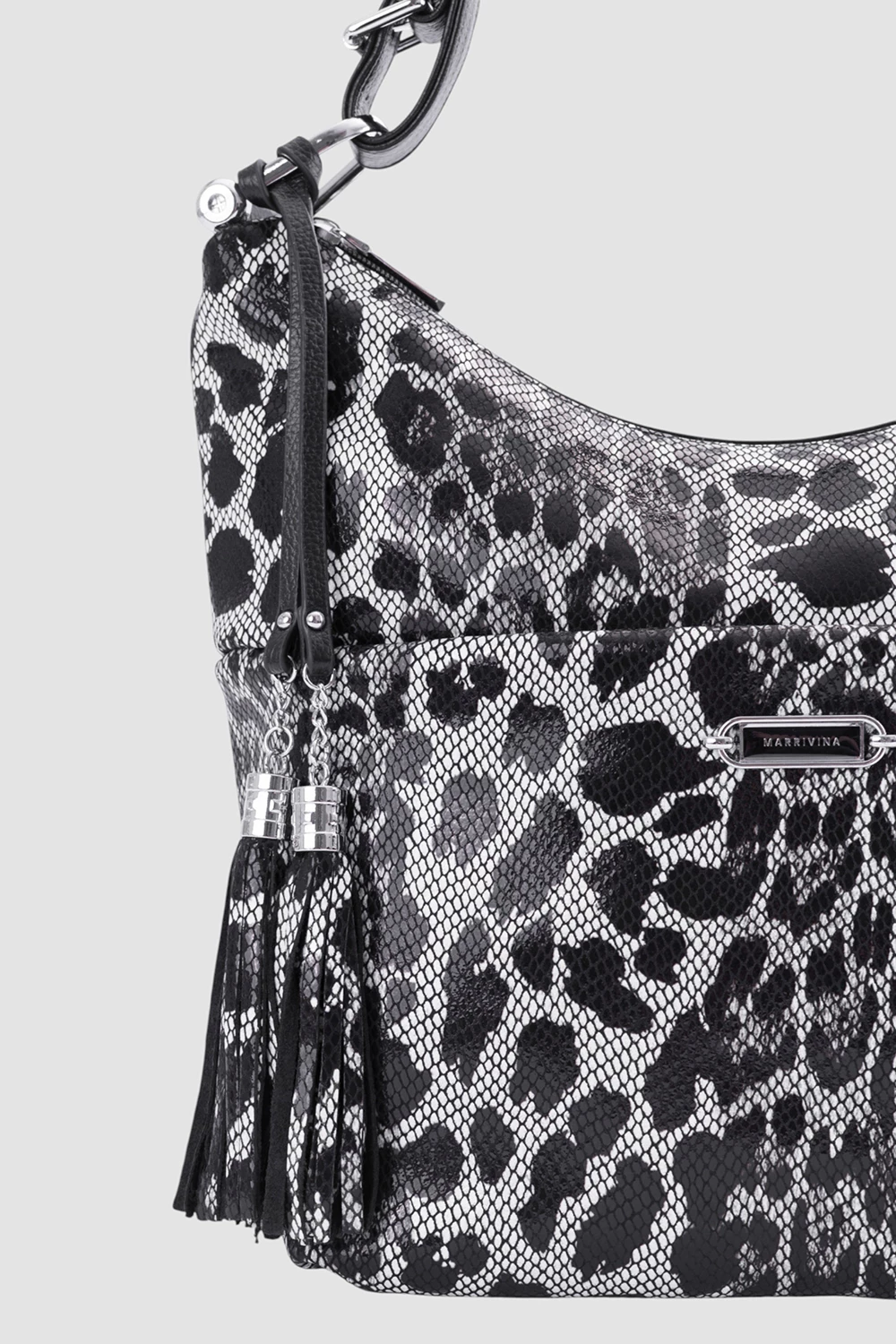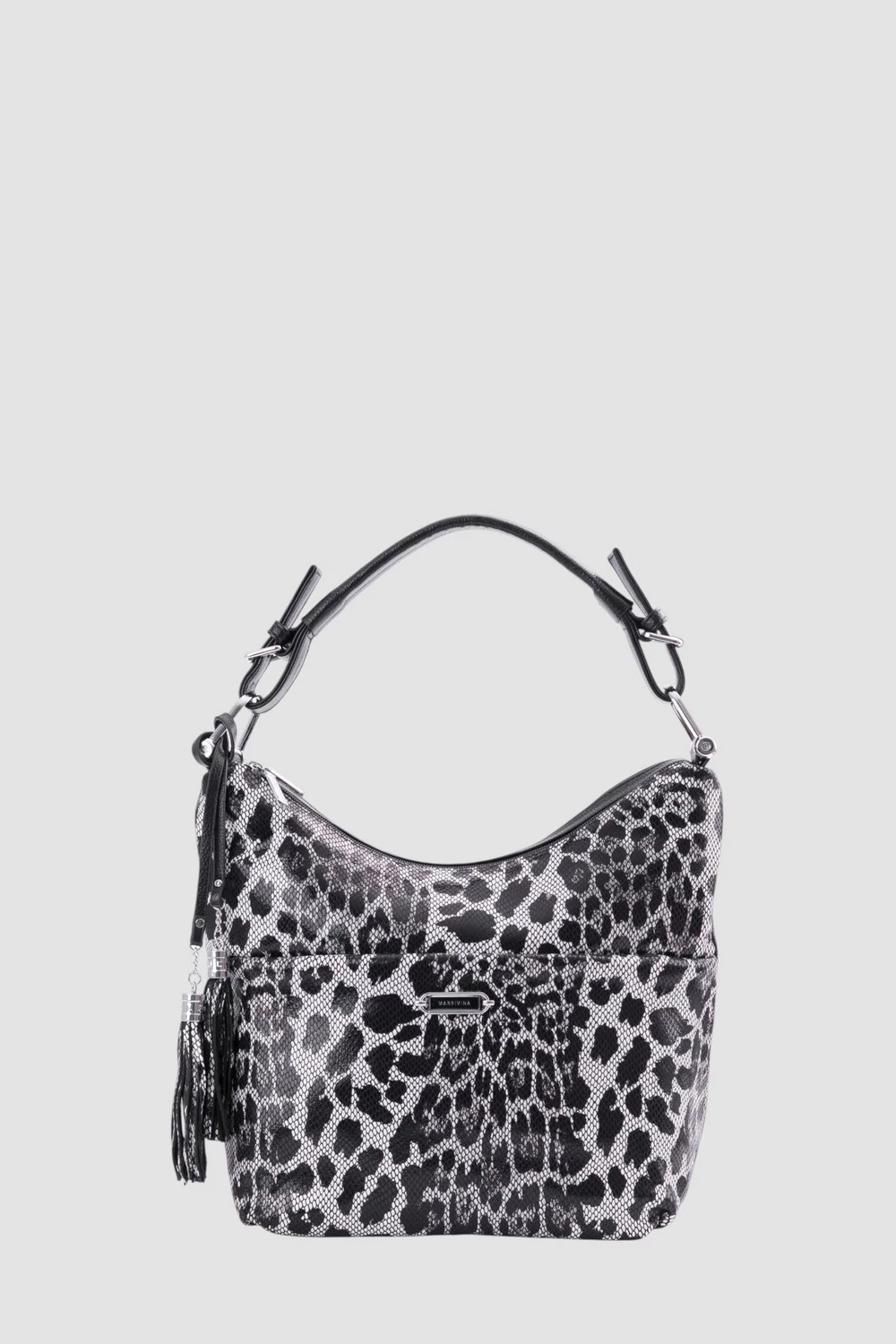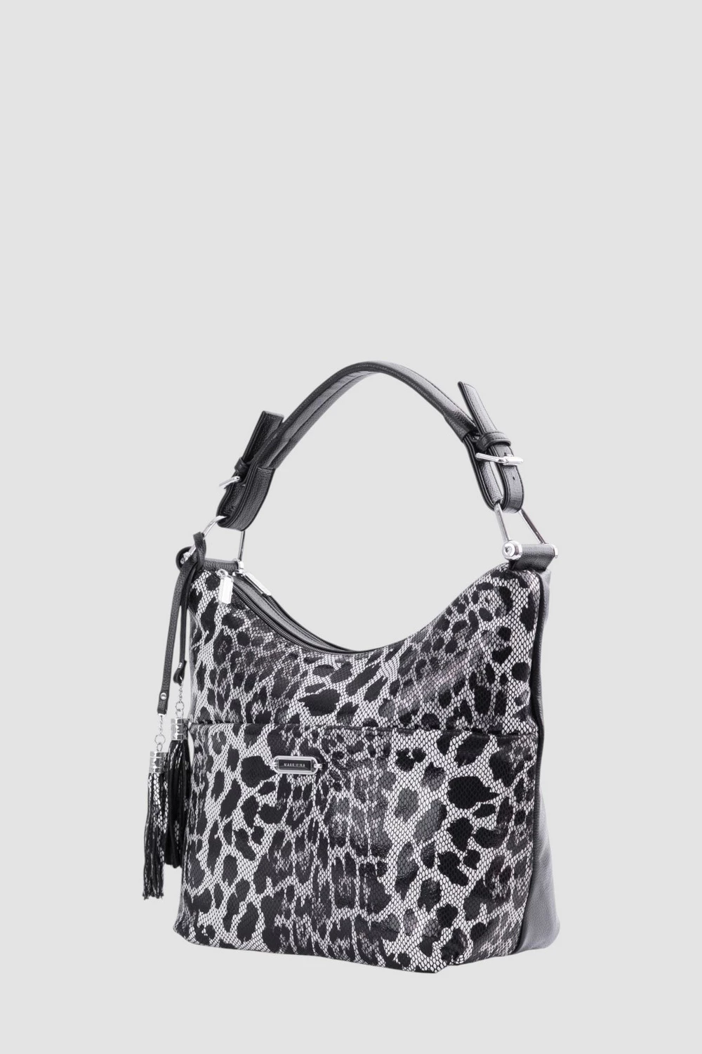 Сумка-мешок леопардового принта на черном фоне выполнена из экокожи и велюра, удачно объединяя стиль и комфорт. Внутреннее пространство поделено на два функциональных отделения, каждое оснащено открытым и закрытым на молнию карманами для размещения вещей.Дополнительные удобства: внешний задний потайной карман на молнии и фронтальным отсеком на магнитной застежке.