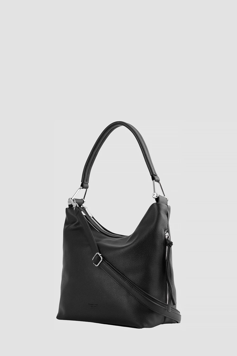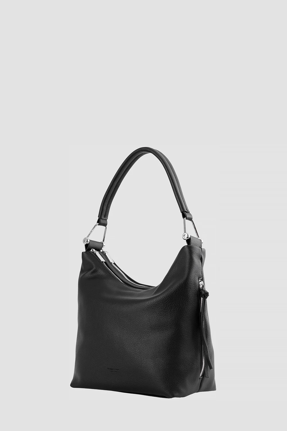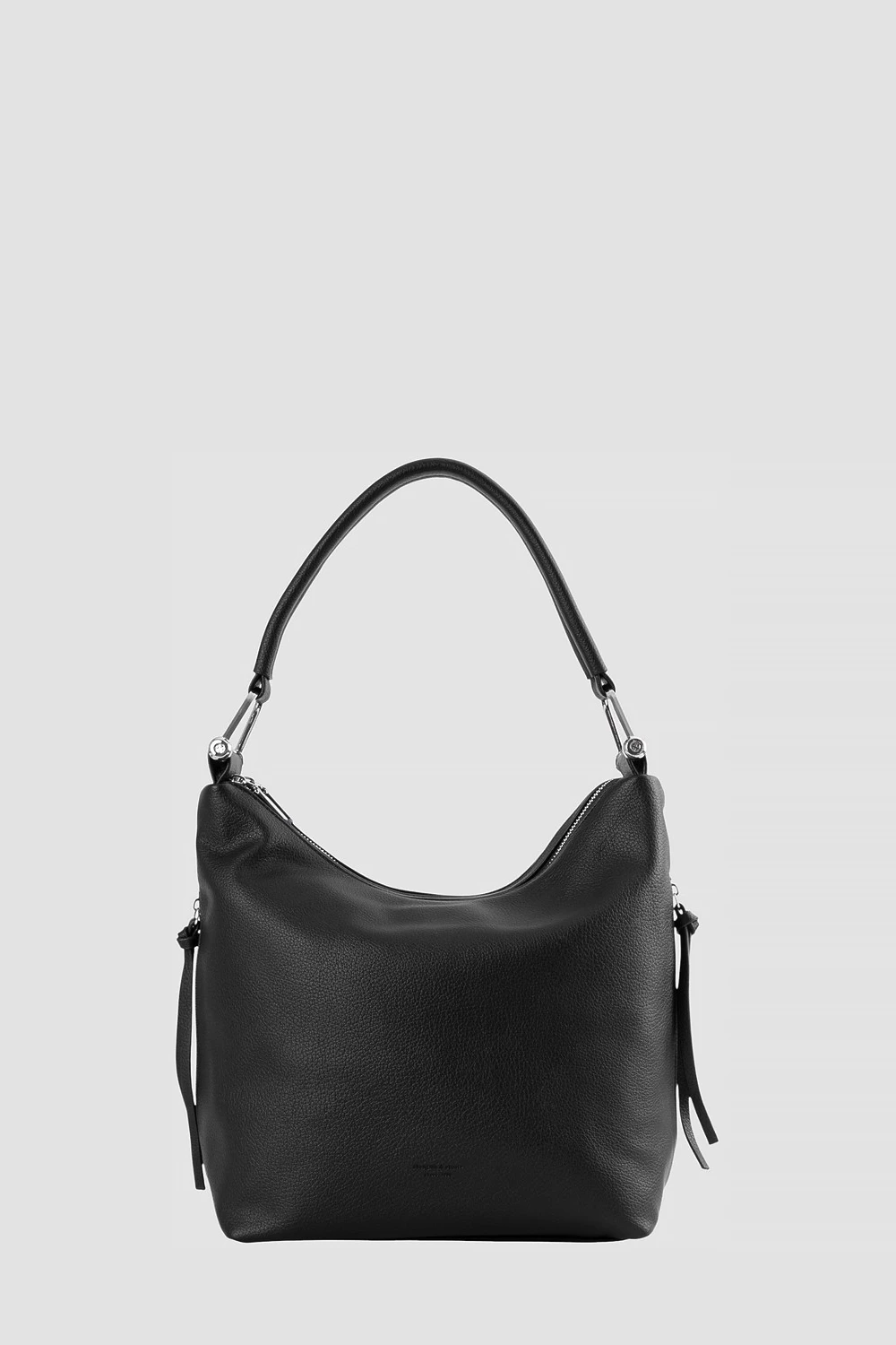 Черная сумка мешок, отличаясь простотой дизайна и утонченностью форм. Оснащена двумя секциями на молнии и двумя внешними боковыми карманами. Особенности внутренней конструкции включают один открытый карман и один закрытый на молнии.В комплект входит один регулируемый длинный ремешок. Внешний карман на молнии расположен на задней стороне изделия.