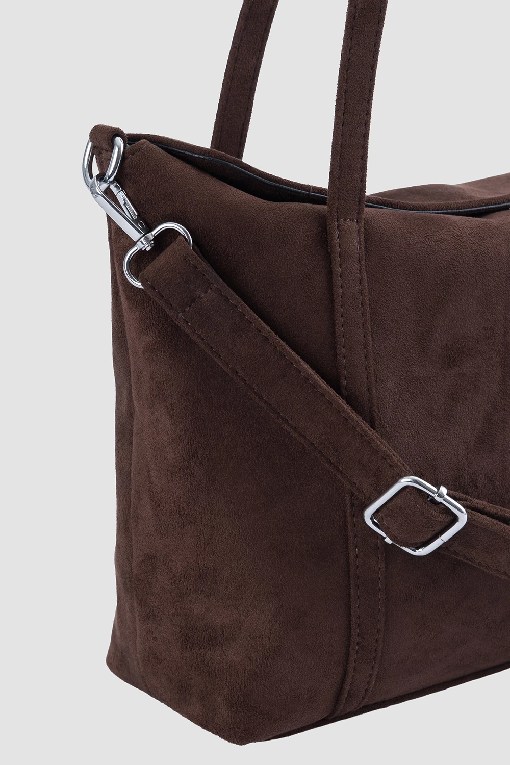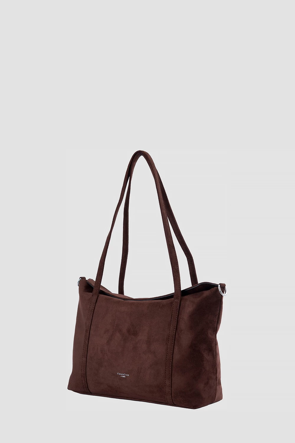 Сумка тоут коричневого цвета. Внутри просторное отделение поделено карманом на молнии, дополнительно оснащены два кармашка, закрыт молнией. Внешне украшена функциональным карманом на застёжке. В комплект входит съёмный регулируемый ремешок.● карман на молнии и открытый карман внутри