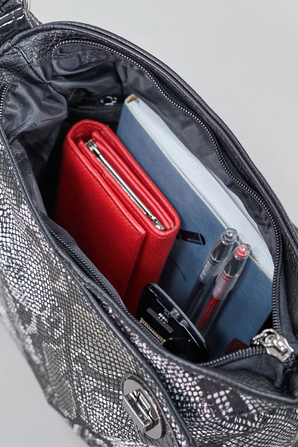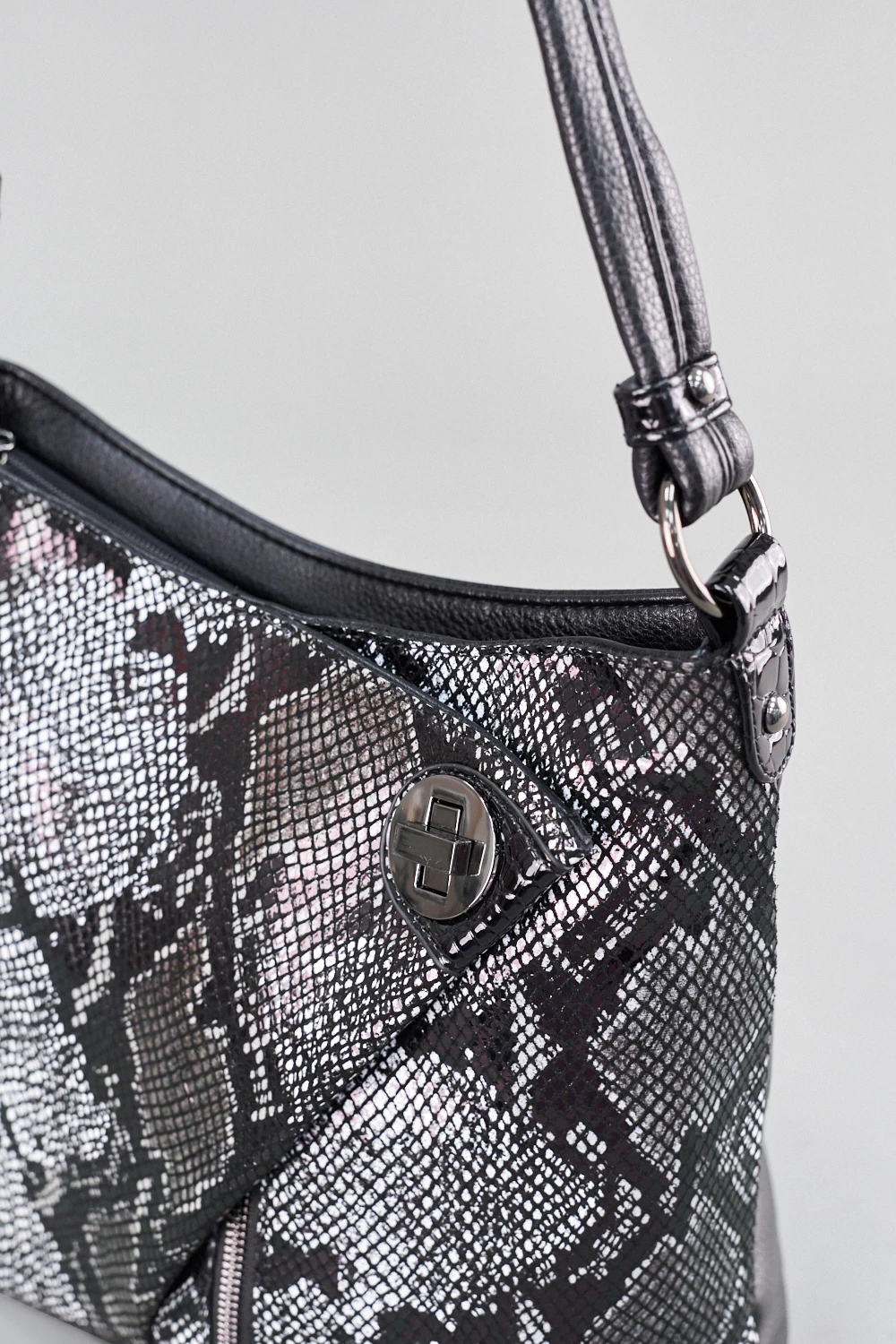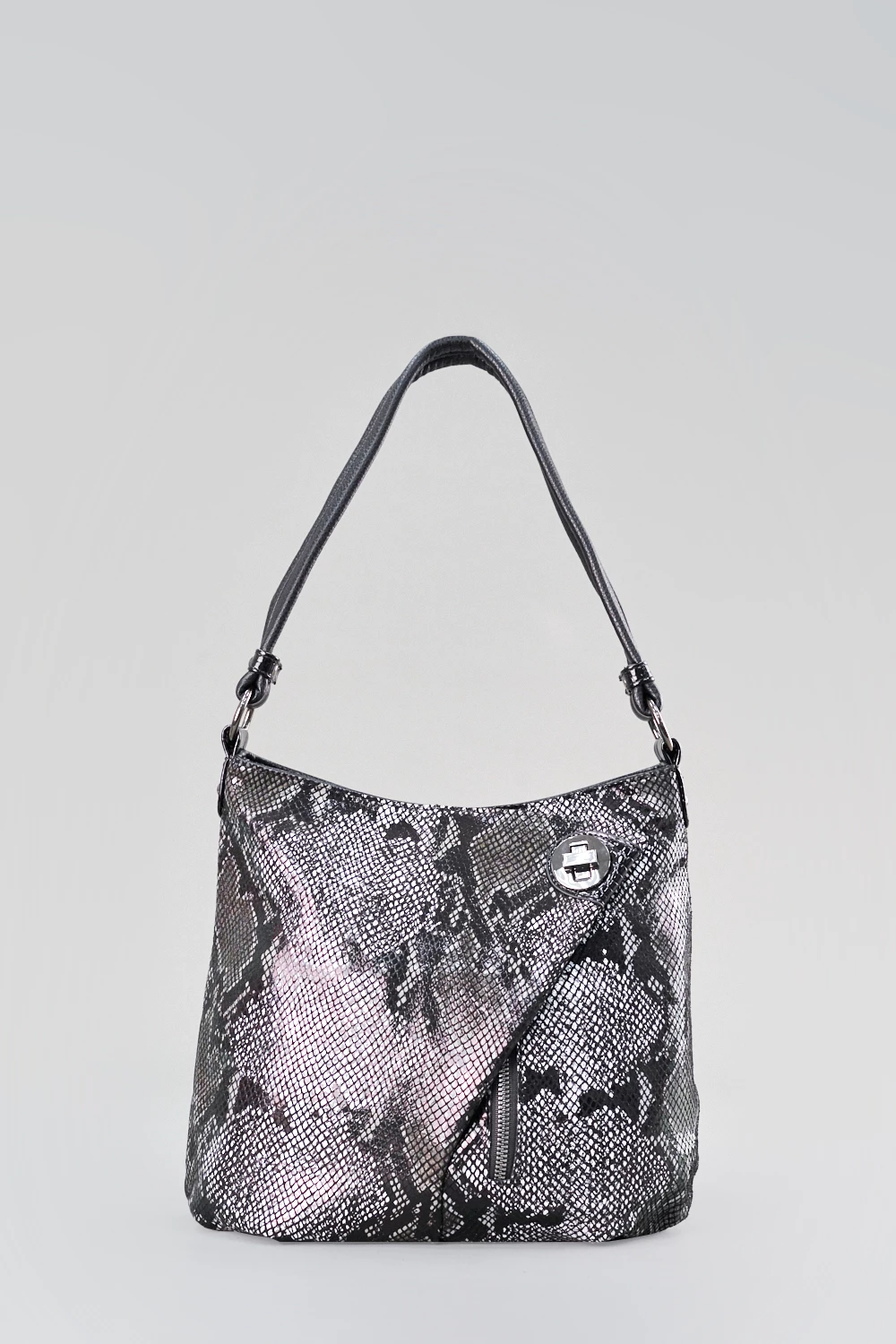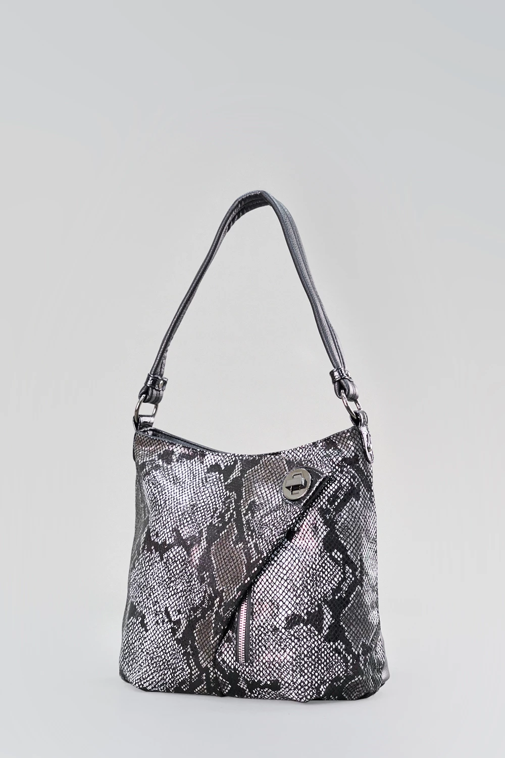 Женская сумка-мешок из экокожи с эффектом змеиной кожи. Сумочка с треугольным клапаном на передней части закрывается на молнию. Внутри два отделения, разделяются потайным карманом на замке для ценных вещей.● текстильный подклад