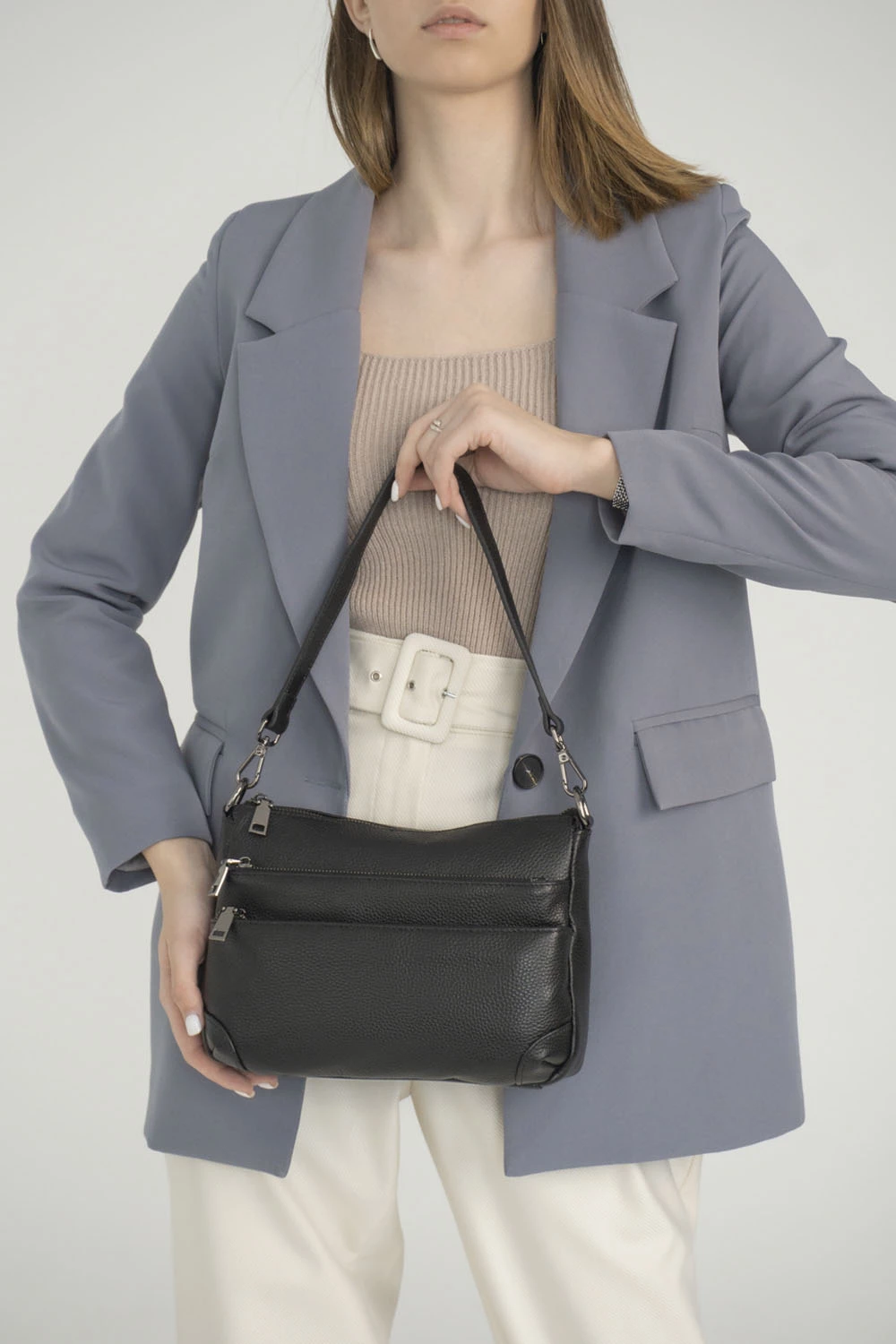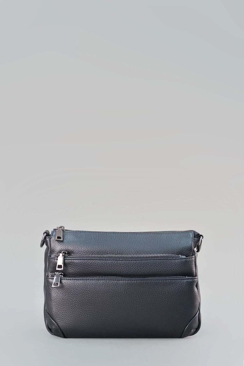 Просторная черная сумка-мессенджер с просторным центральным отделением, оснащенным карманом на молнии. Дополнительные удобства обеспечивают два боковых отсека и внутренний карман.Фронтальная сторона украшена дополнительным карманом на застёжке. Универсальность обеспечивает два ремня: короткий и длинный регулируемый.