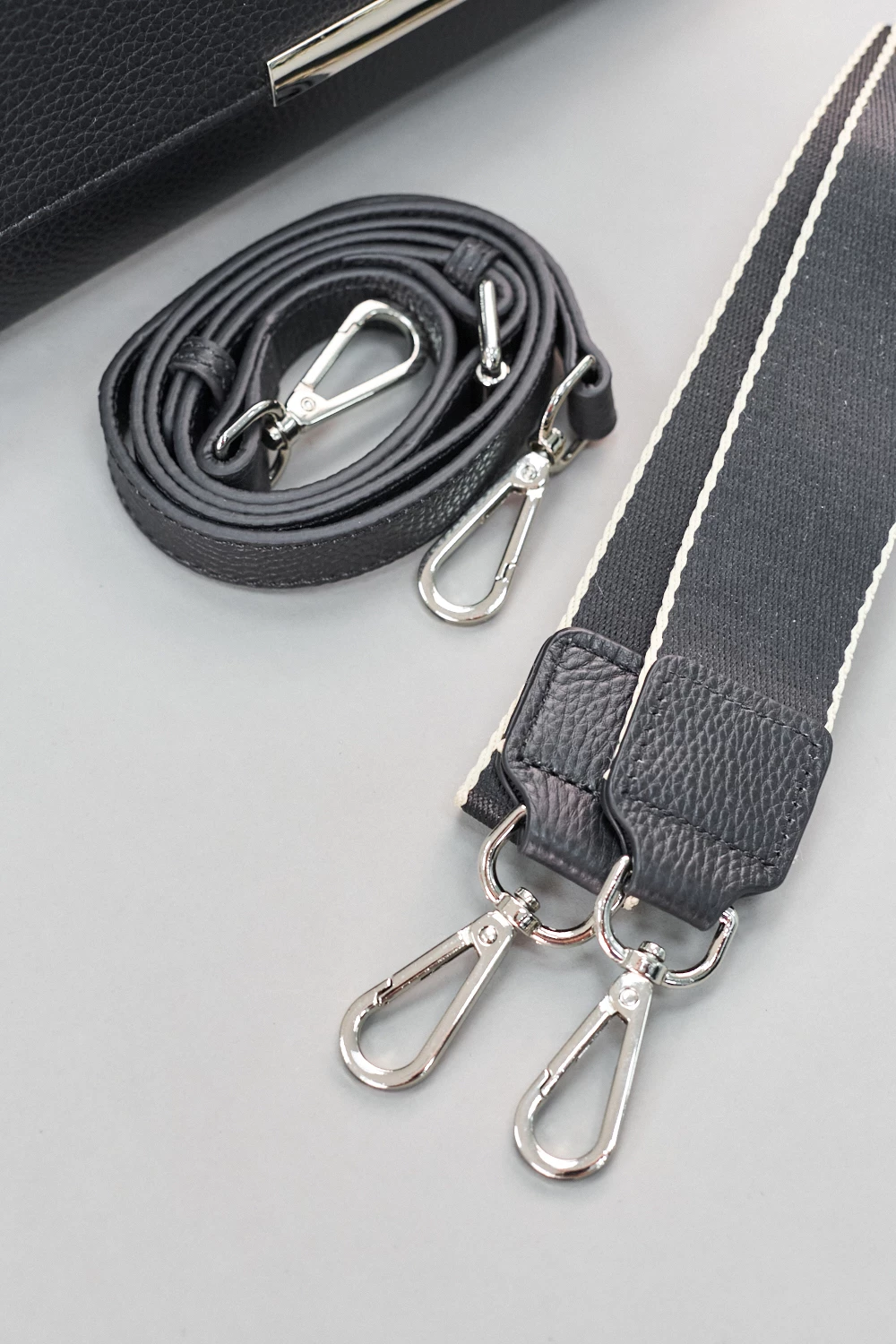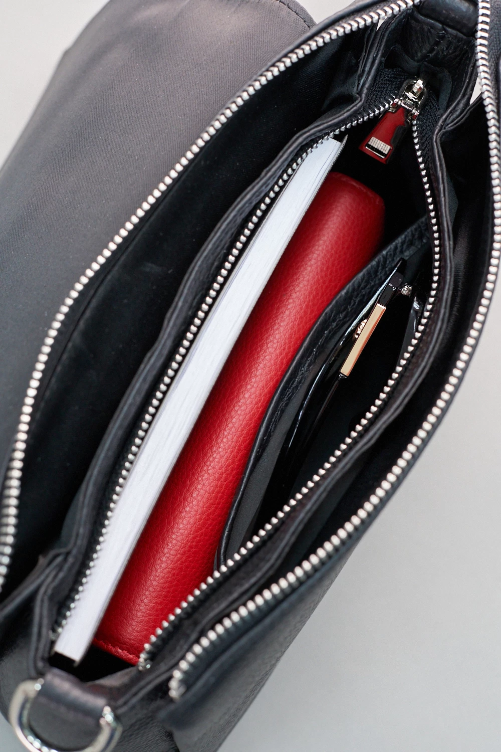 Черная женская сумка станет для повседневной жизни и на вечерних мероприятий. Сумочку легко сочетать благодаря универсальному цвету. Внутри нее расположены три отделения, в каждом из которых найдется место телефону, кошельку и косметичке. Закрывается сумка на клапан с декоративным элементом.Два съемных ремня позволяют менять образ: текстильный подходит для прогулок днем, а элегантный кожаный дополнит вечерний look. Потайной карман на молнии обеспечит безопасность вещей. Носите такую сумку в офис, на прогулку по городу или на романтический ужин.