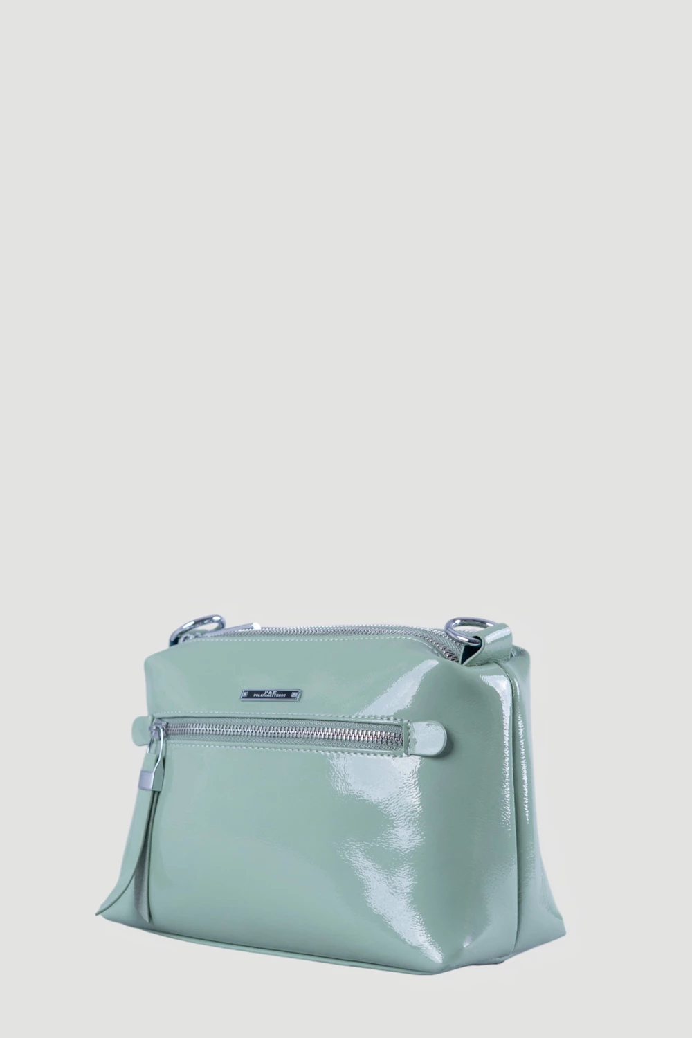Сумка-мессенджер зелёного цвета из натуральной кожи с лаковым покрытием. Имеет три внутренних отделения на молнии. Снаружи расположены два вместительных кармана с замком. В комплекте предусмотрен регулируемый ремень.● внутри два открытый кармана и один карман на молнии