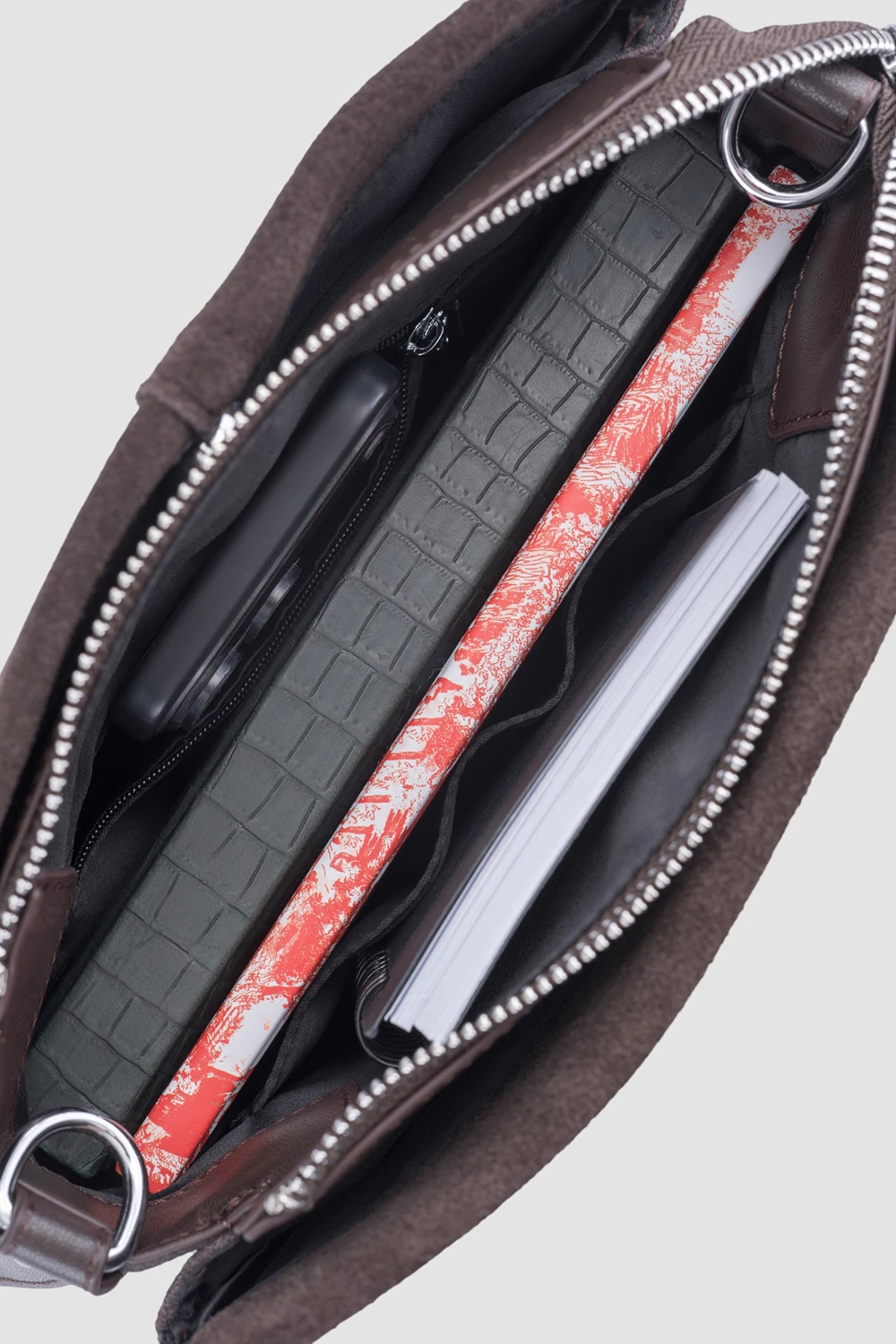 Коричневый велюровый мессенджер: элегантность и вместительность. Стильный мессенджер в насыщенном коричневом цвете из мягкого, приятного на ощупь велюра.Одно отделение на молнии, два отделения на магнитах и потайной карман сзади. В комплекте два кожаных ремешка: классический для удобства и декоративный – для создания изысканных образов.