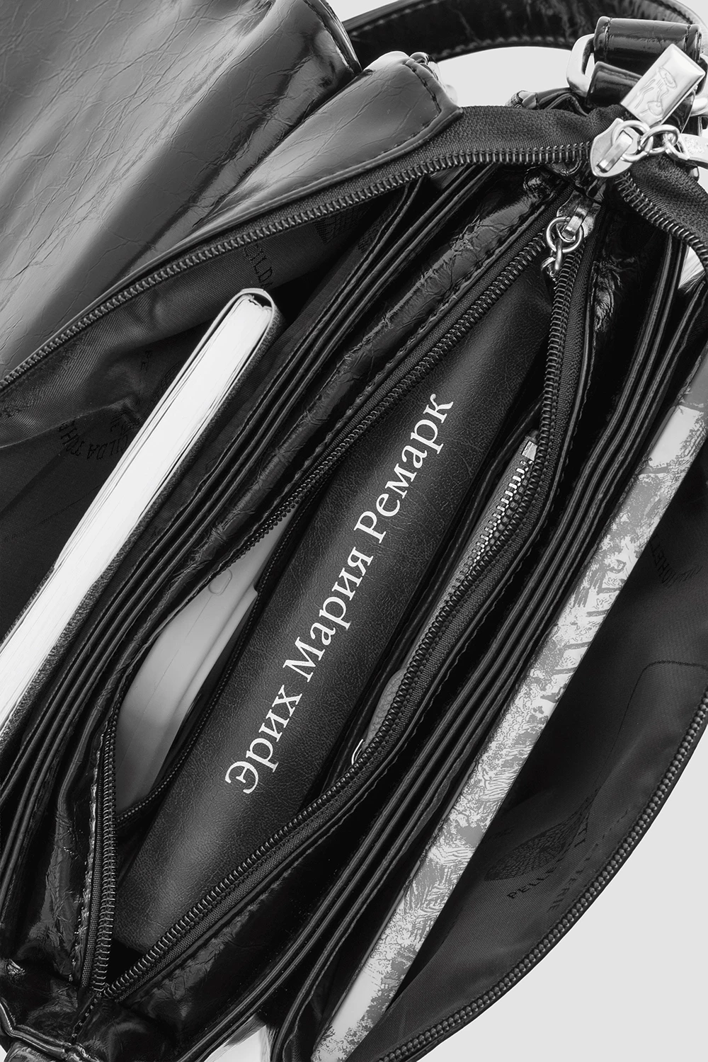 Классическая сумка-мессенджер на каждый день, выполненный в черном цвете. Изготовлена из экокожи с масляной обработкой.Сумка оснащена тремя секциями, центральная из которых дополнена открытым карманом и одним карманом на молнии. Для организации мелочей предусмотрен дополнительный задний карман на молнии.