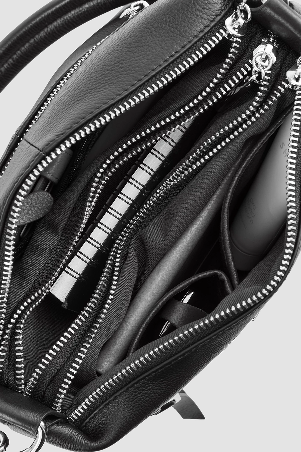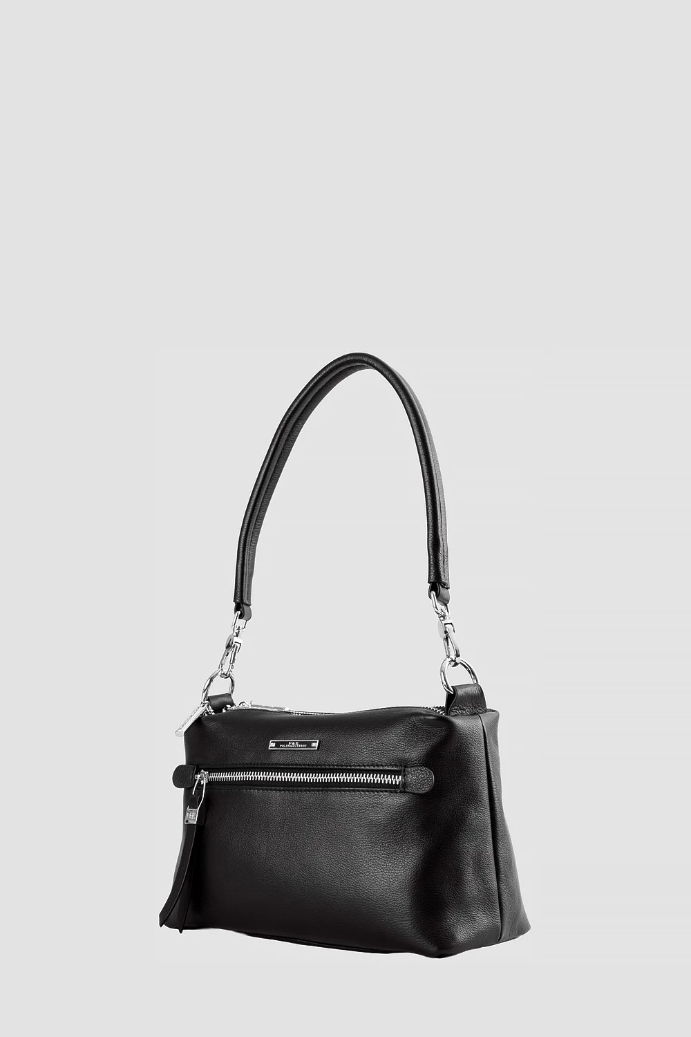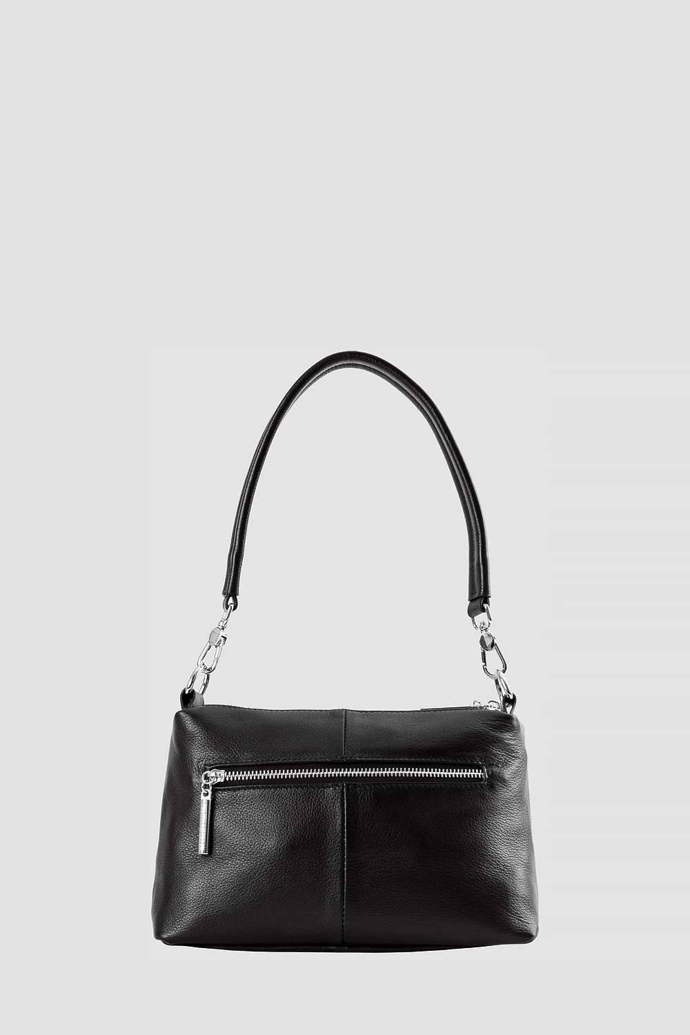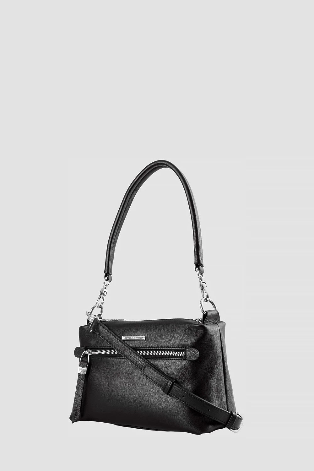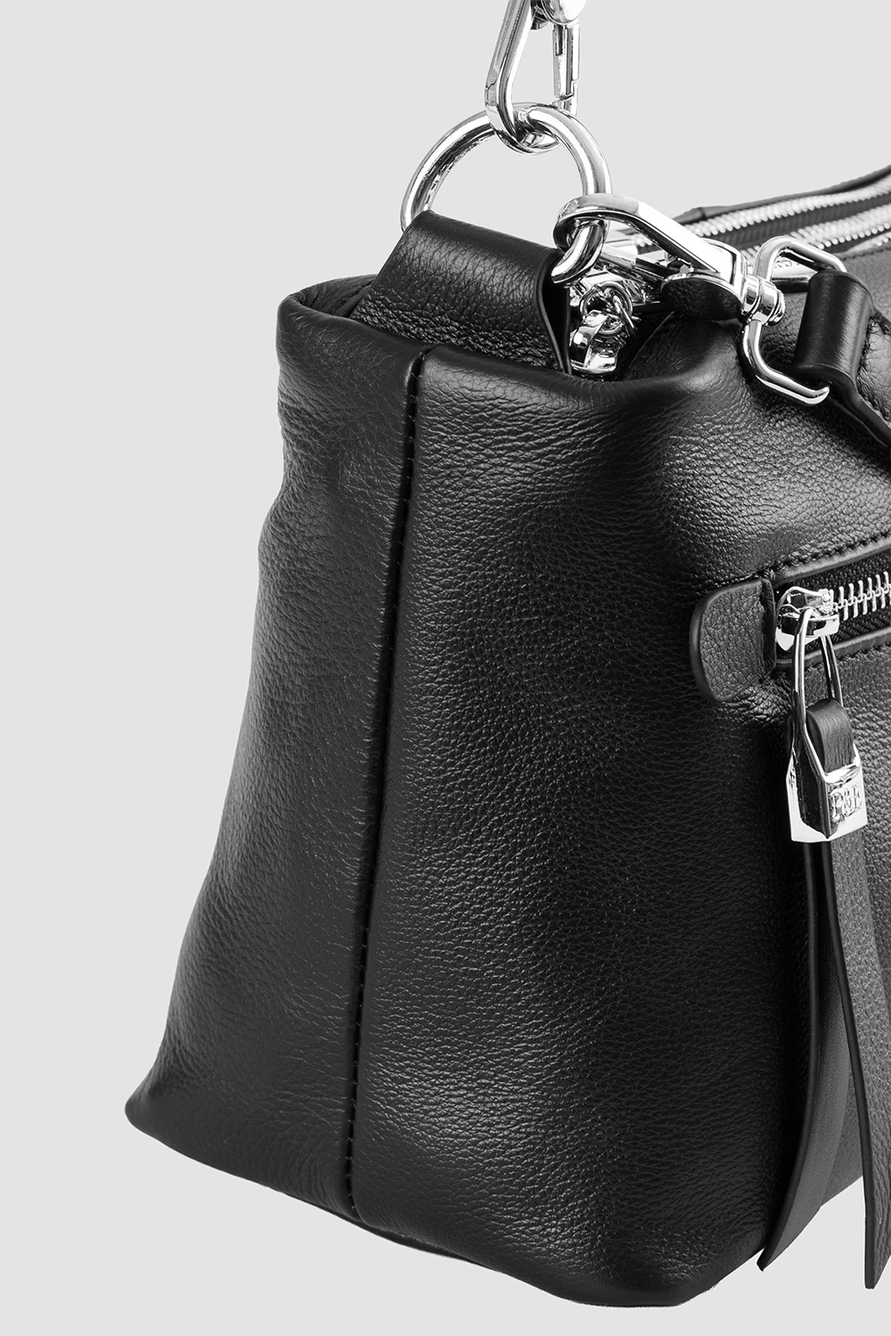 Сумка-мессенджер чёрного цвета из натуральной кожи. Внутри три отделения: два открытых кармана и один на молнии.Наружные элементы включают два кармана на замке. Комплектуется регулируемым ремнём для комфортного ношения.● внутри два открытый кармана и один карман на молнии