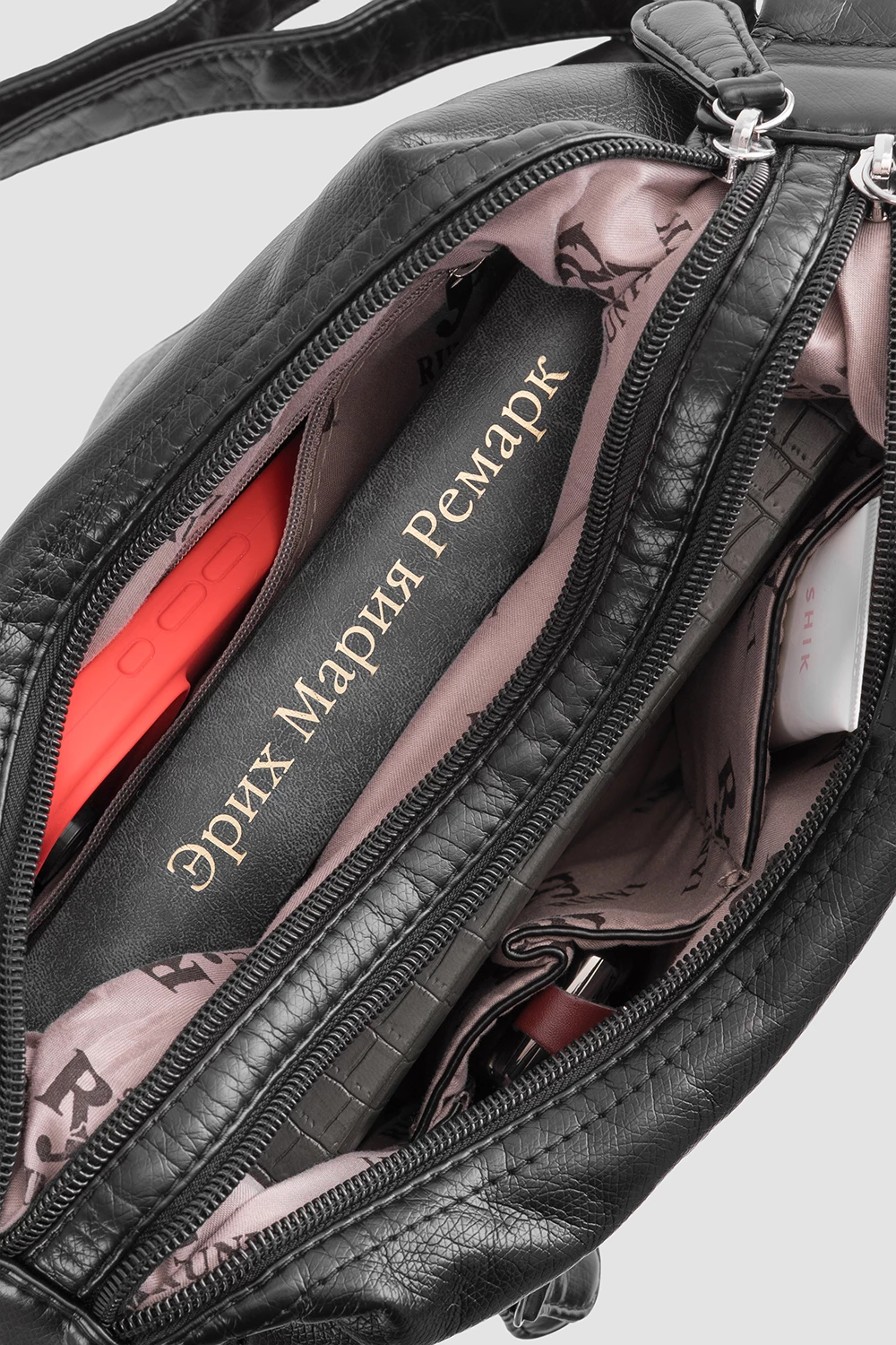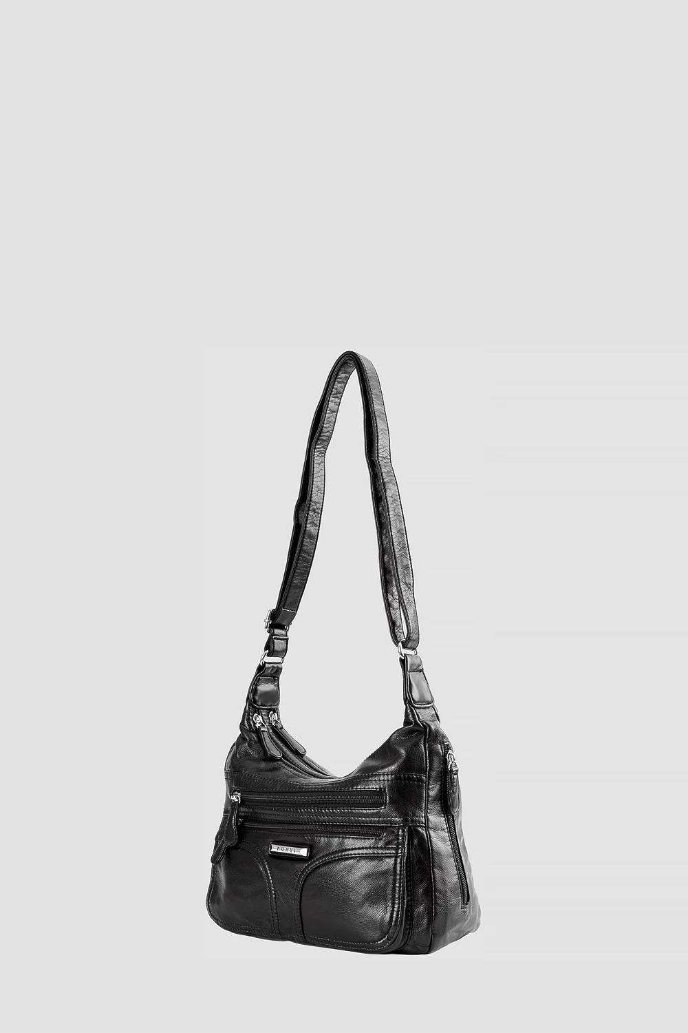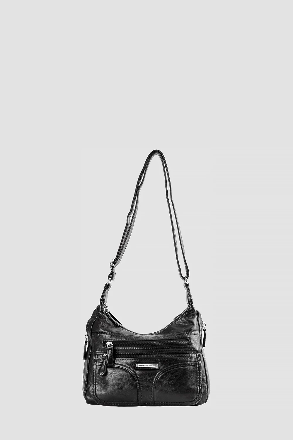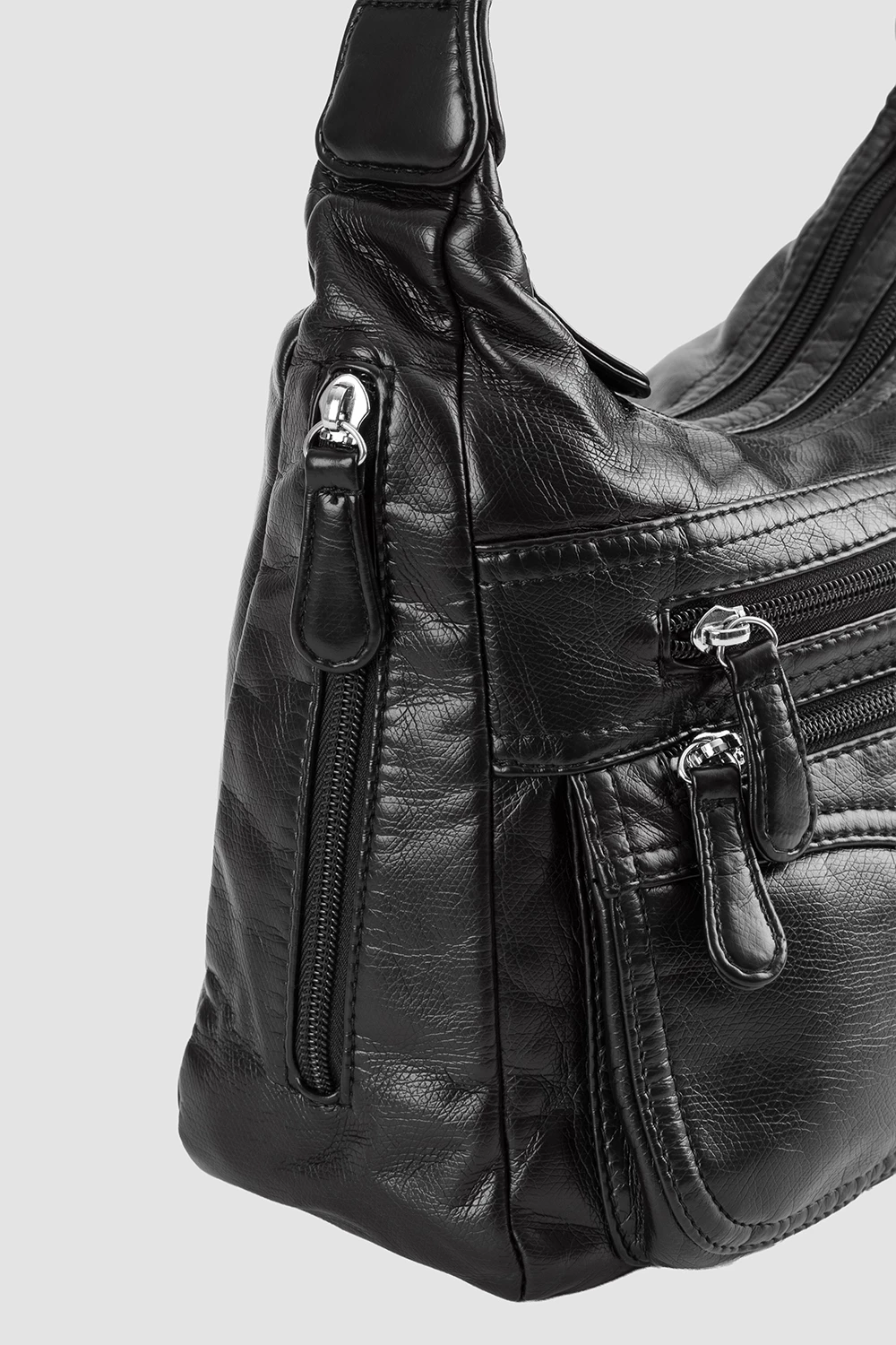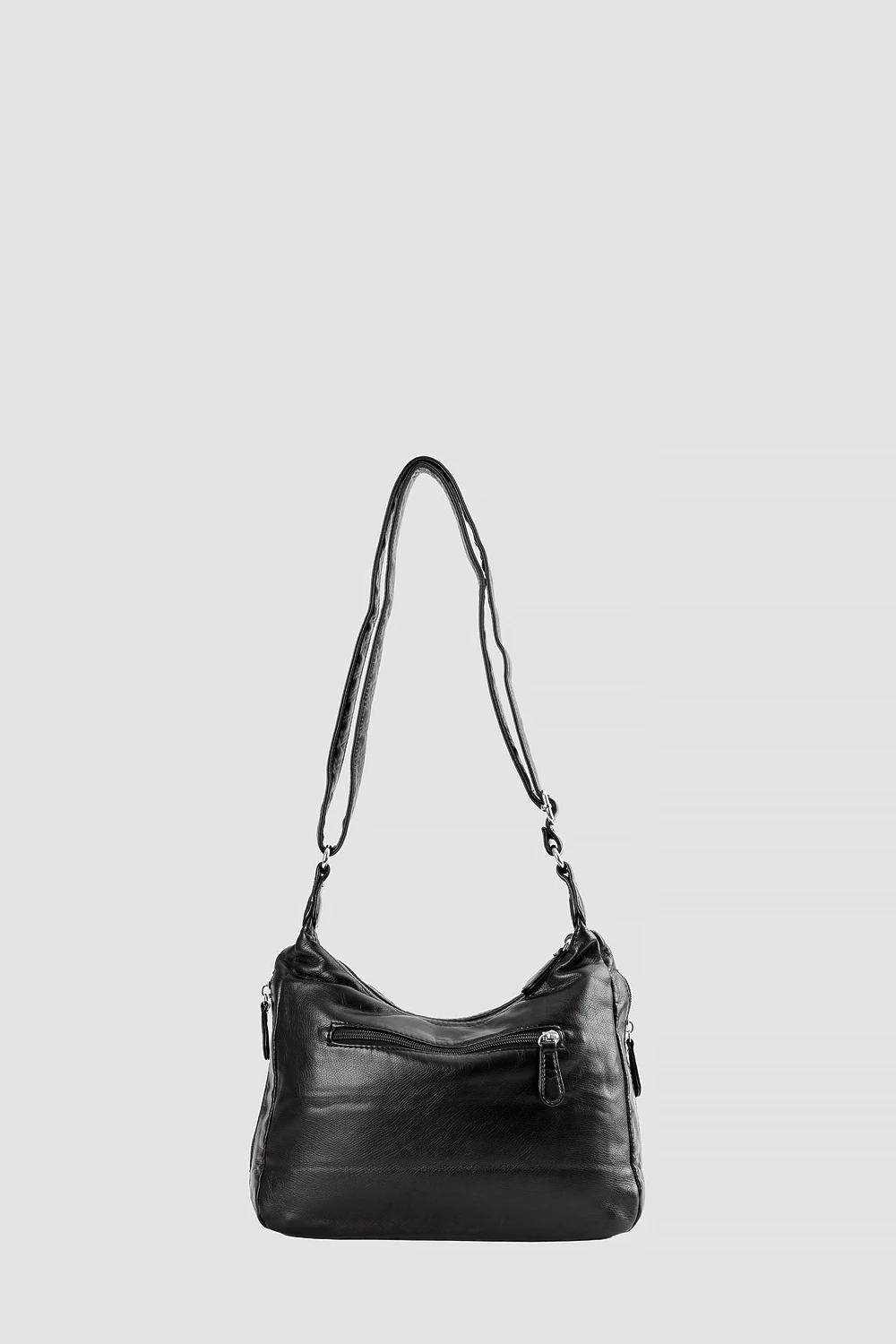 Классический чёрный цвет делает сумку универсальной и подходящей к различным образам. Внутреннее пространство поделено на две части, снабжённые карманами: двумя открытыми и одним на молнии. Внешне дополнен двумя карманами на молнии, а сзади расположен дополнительный карман для мелочей.● регулируемый плечевой ремень