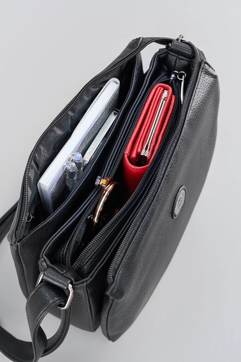 Компактная и лаконичная сумка-мессенджер подходит под любой образ: от повседневного до элегантного вечернего! Находка для любителей комфорта: три внутренних отдела вмещают в себя смартфон, ключи, очки и даже косметику, а во внешнем кармане на молнии легко найдется место для пластиковых карт или салфеток.● модель для повседневной носки