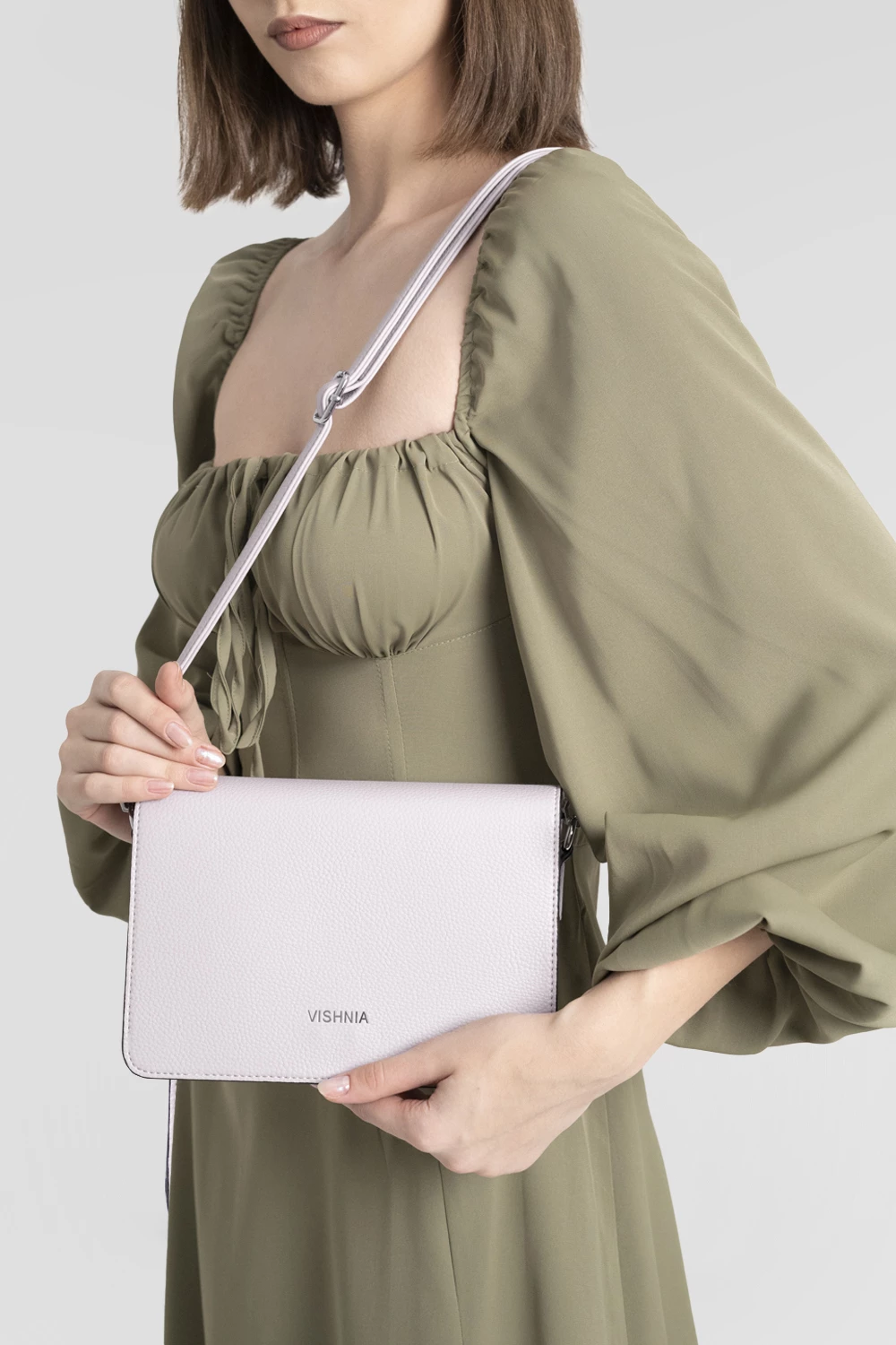 Женская сумка-мессенджер светло-серого цвета из экокожи. Универсальный съемный ремень с регулировкой длины. Внутри три отделения один отдел на молнии. Надежная магнитная застежка. Светло-серый оттенок сочетается с разными стилями одежды.● внутри два открытый отдела и один отдел на молнии