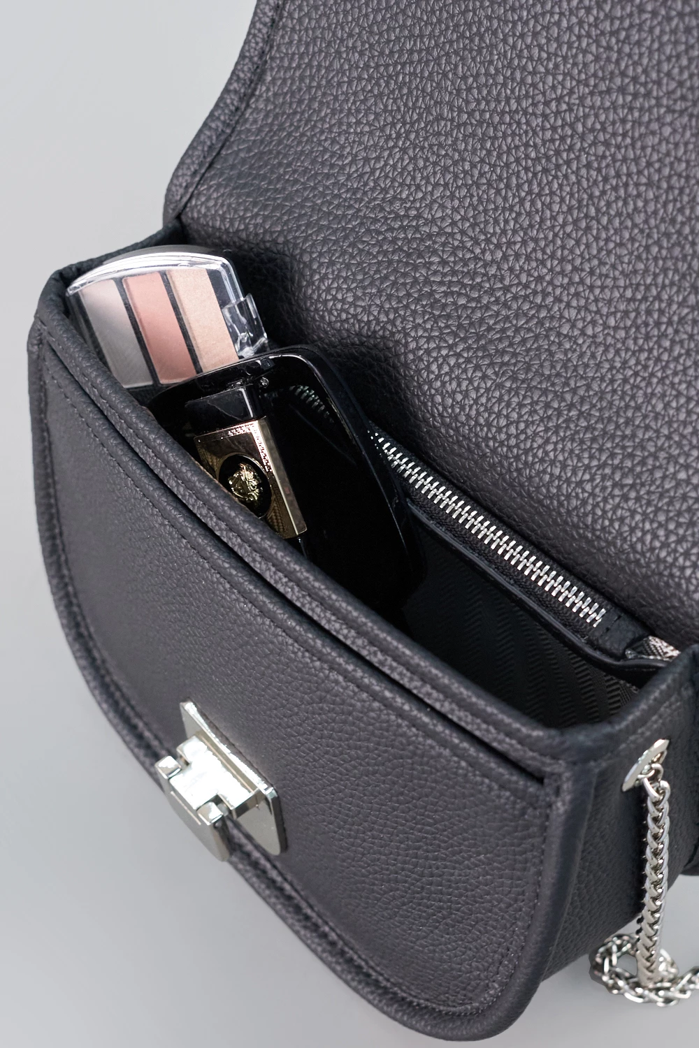 Сумка сэдл с металлической цепочкой вместо ремня. Женская сумочка выполнена из натуральной кожи. Аксессуар с поворотным металлическим замком. Вместительное отделение для телефона, бумажника, косметики и личных мелочей.● поворотный металлический замок
