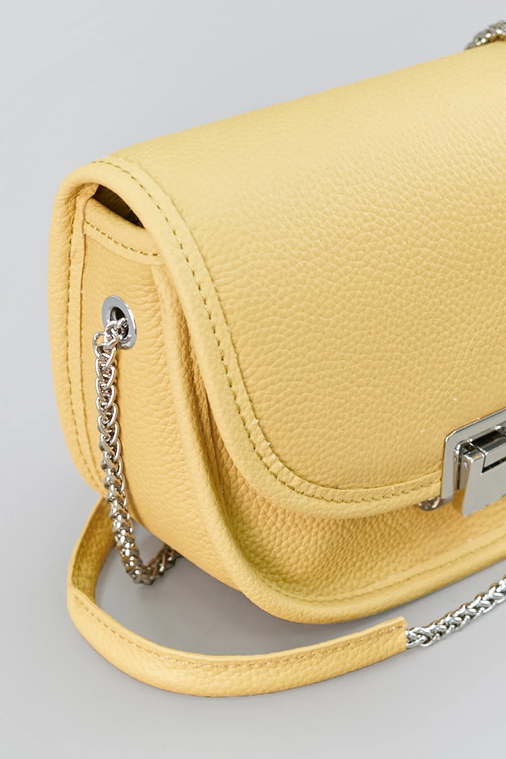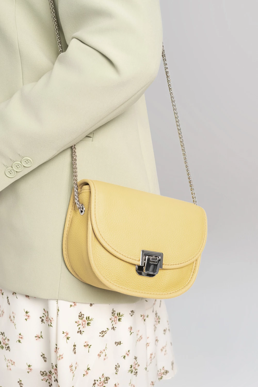 Яркая сумочка сэдл солнечного желтого цвета из натуральной кожи. Цепочка с кожаной вставкой для комфорта при ношении. Сочетается с летним сарафаном и светлыми образами. Женская сумка стильный аксессуар для теплого сезона.● нерегулируемый ремень