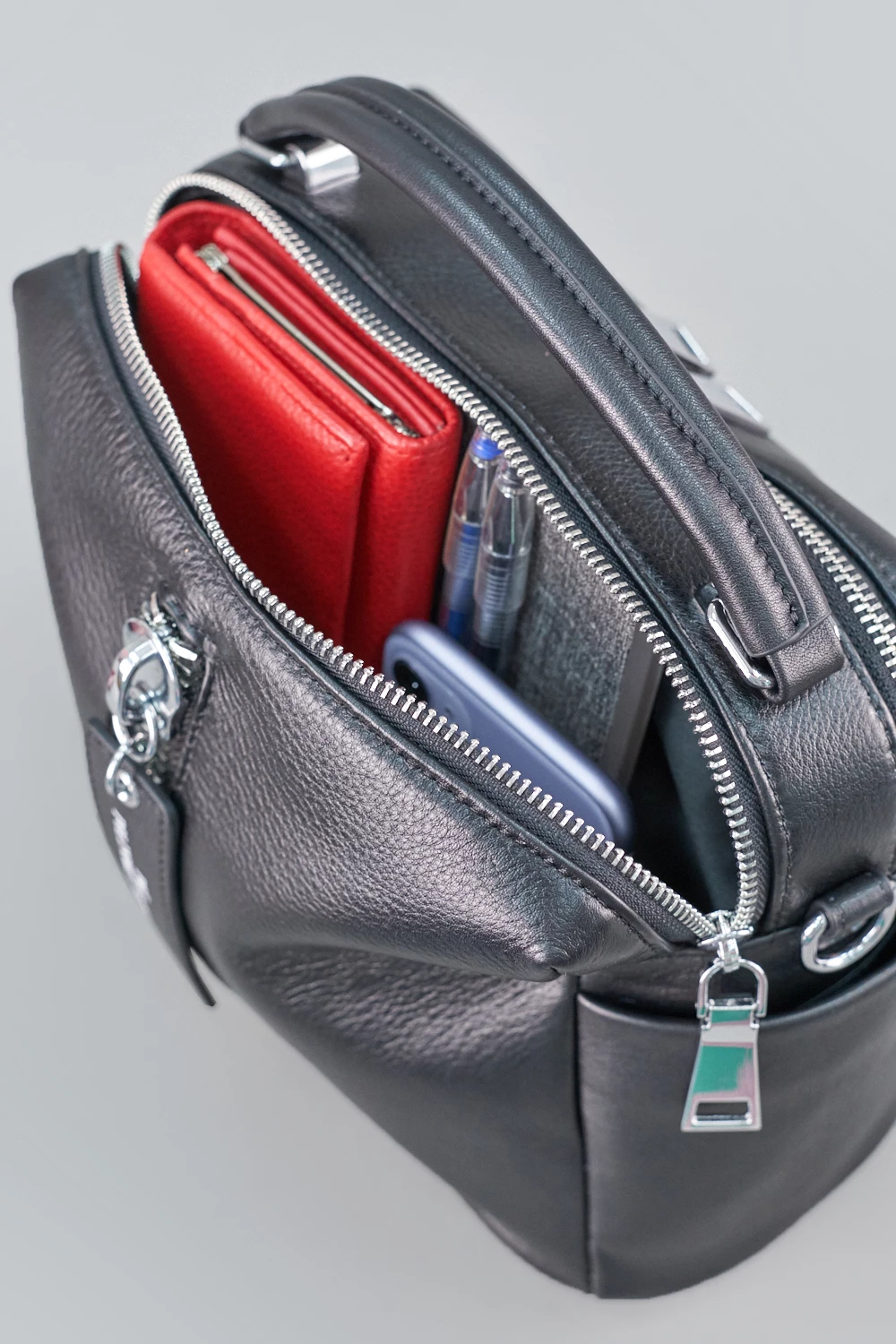 Черная сумка-мессенджер из натуральной кожи с двумя отсеками на молниях, внутри - открытый карман и отделение на замке.По бокам предусмотрены дополнительные карманы: один открытый, другой на молнии. В комплект входят съемные ремешки - кожаный и текстильный. Практична и вместительна.
