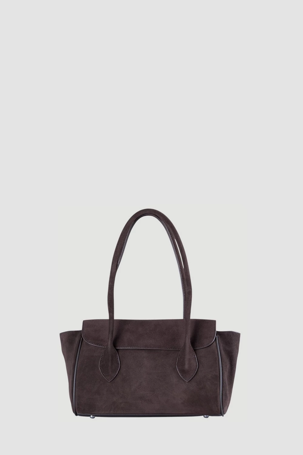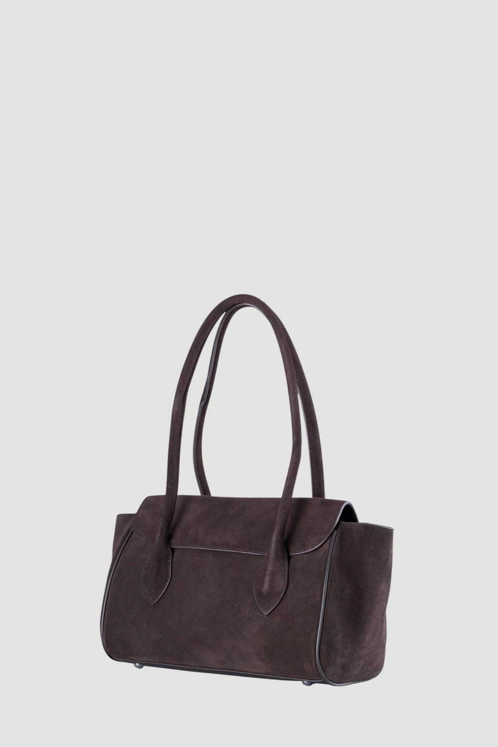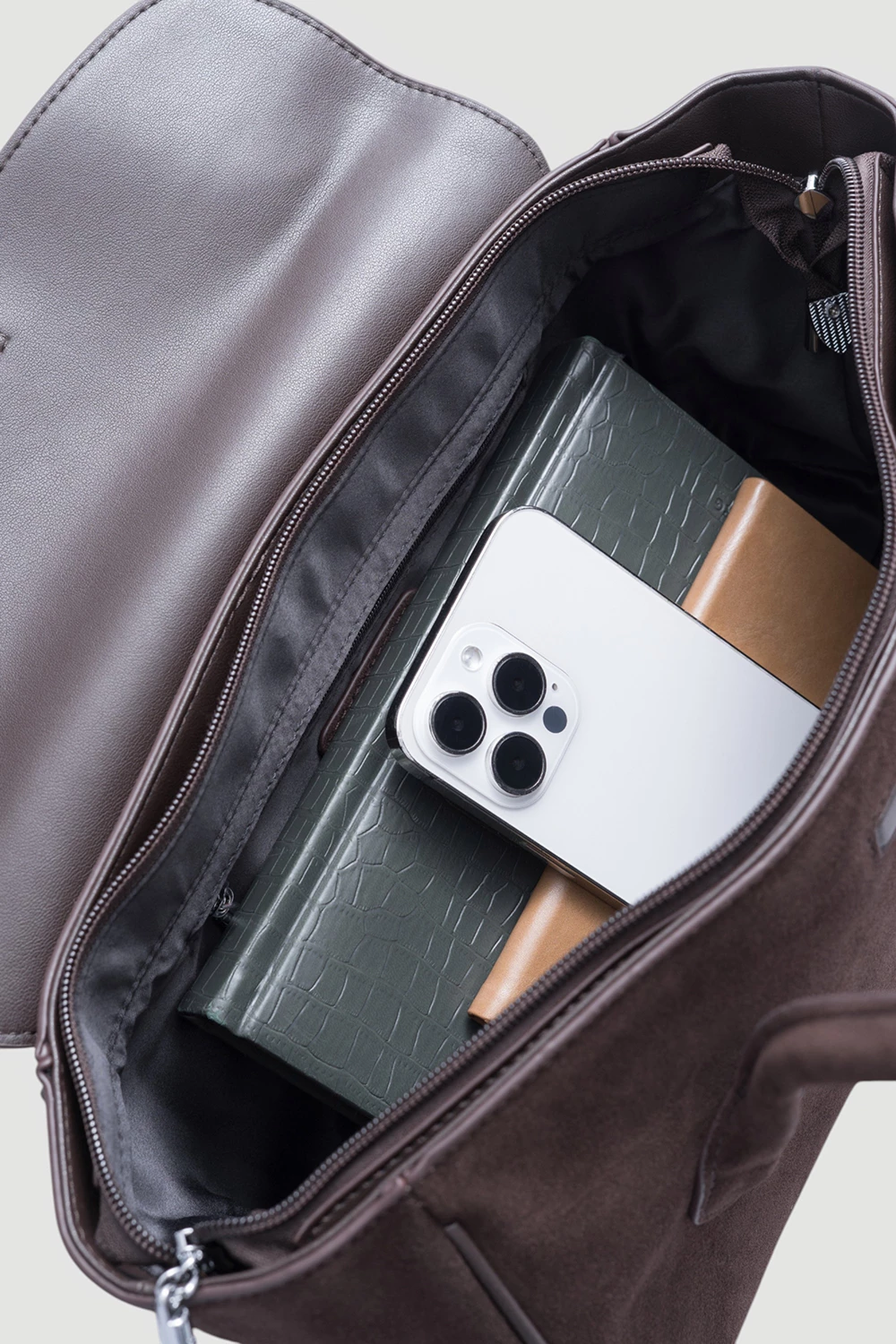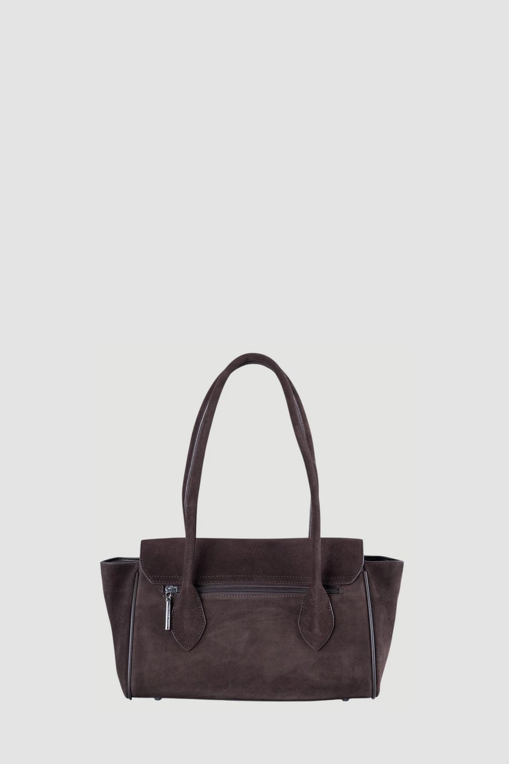 Сумка-сэтчел коричневого цвета выполнена из натуральной кожи и велюра. Внутри расположен один вместительный отсек с двумя открытыми карманами и одним на молнии.Изящный внешний вид и натуральные материалы делают сумку идеальным выбором для любителей классического стиля.