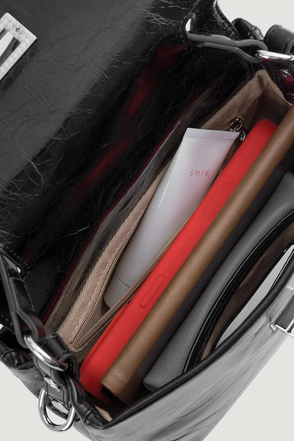Красная сумка сэтчел с внутренним отделением, включающим два закрытых кармана на молнии и один свободный карман. Снаружи предусмотрена кнопка для доступа к нужному карману. Модель укомплектована длинным ремнём для комфорта в повседневном использовании.● накладной карман