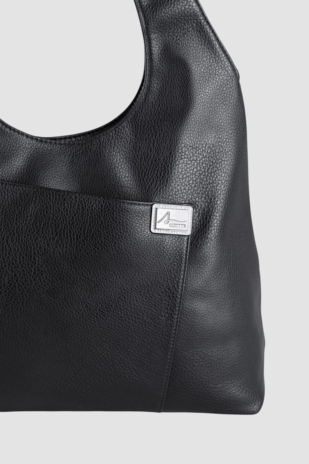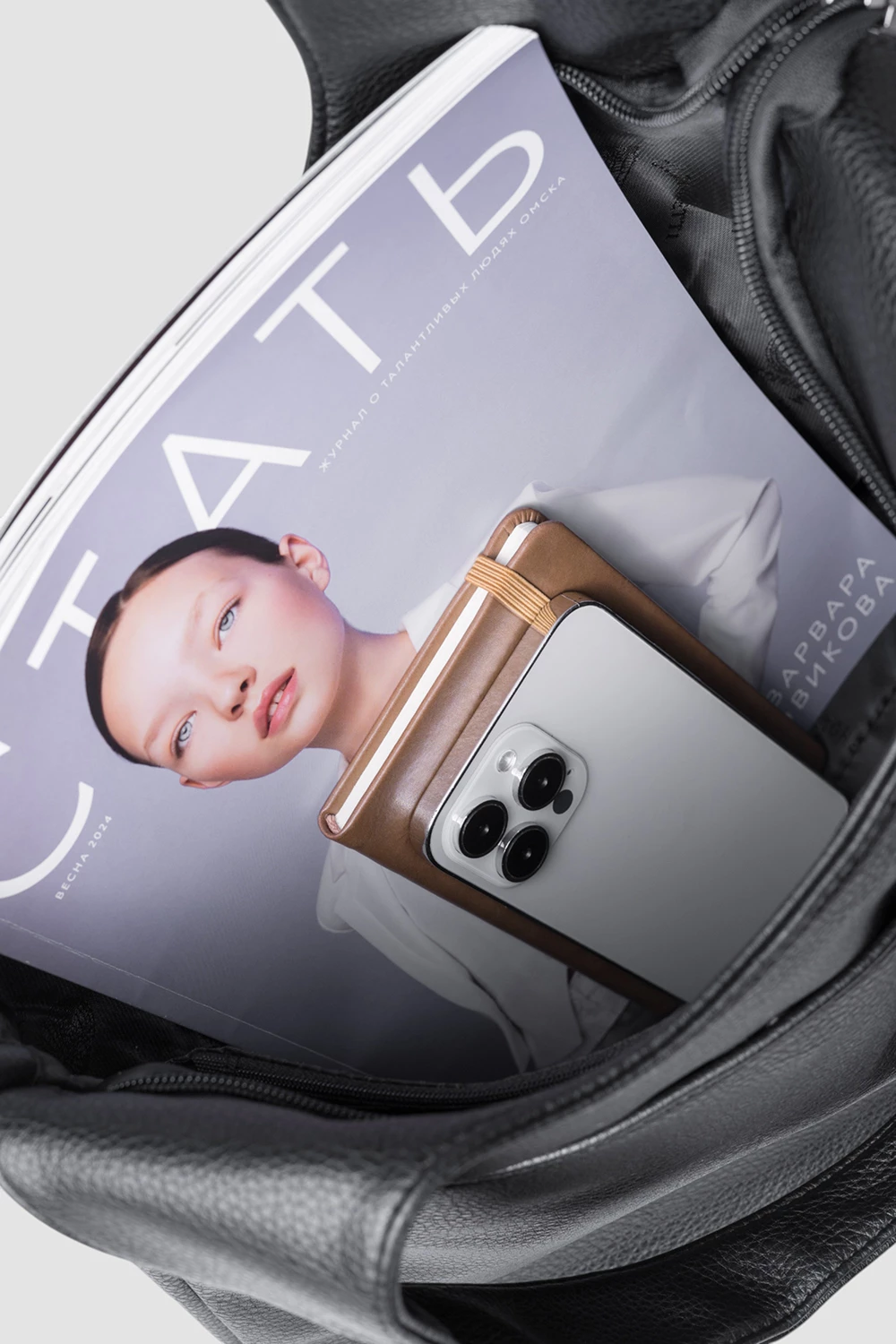 Сумка шоппер чёрного цвета с продуманным внутренним пространством: два отделения разделены карманом на молнии, дополняются двумя открытыми и одним закрытым карманом. Наружная отделка включает задвижной карман на молнии и фронтальный отсек на кнопке.● внешний карман на замке для мелочей