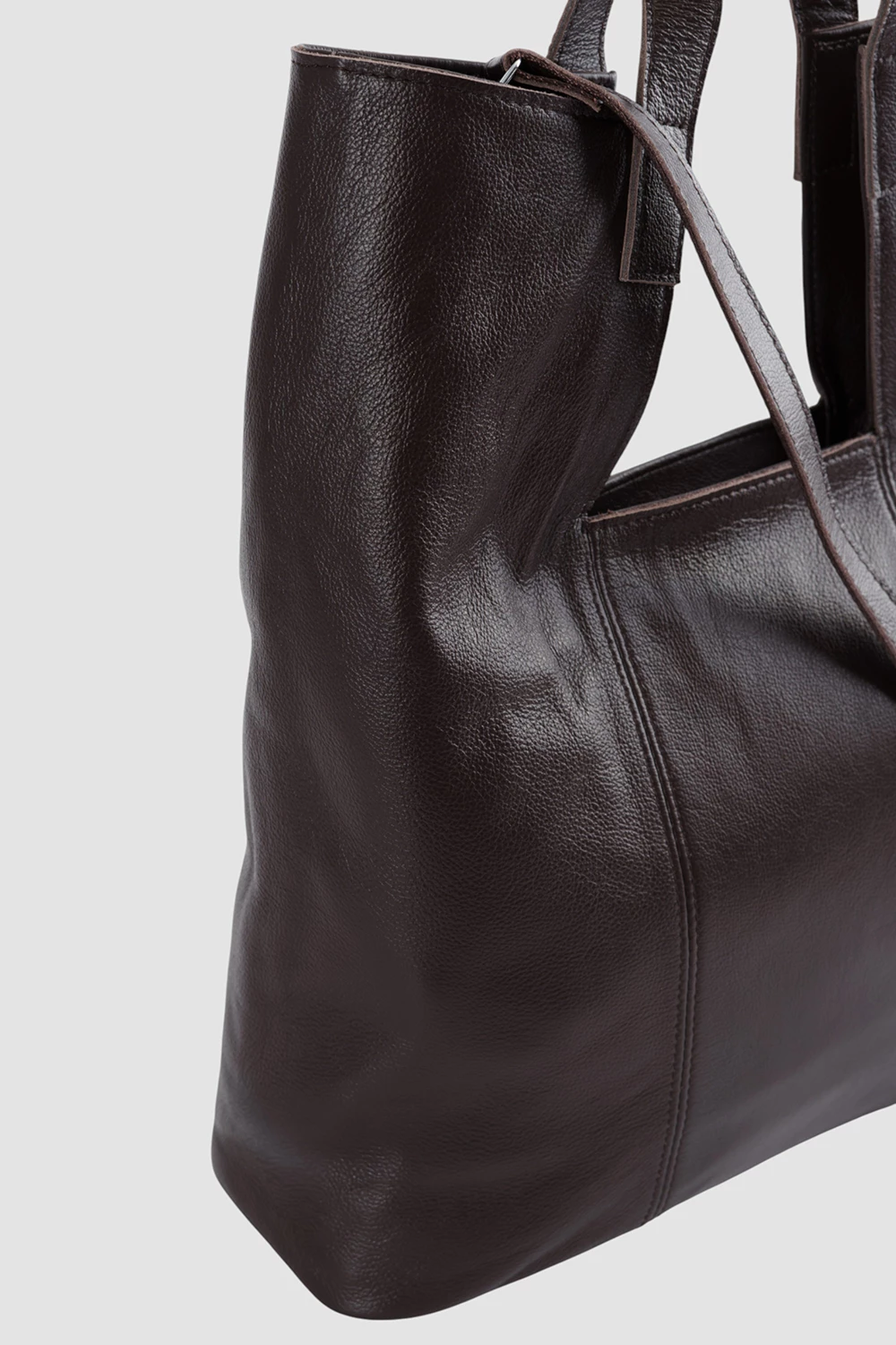 Трендовая сумка-шоппер из натуральной кожи насыщенного коричневого цвета станет дополнением образа. Просторный дизайн предусматривает два отделения, объединенных центральным карманом на молнии.Интерьер сумки оборудован открытым карманом для мелких предметов и отдельным безопасным отделом на молнии.