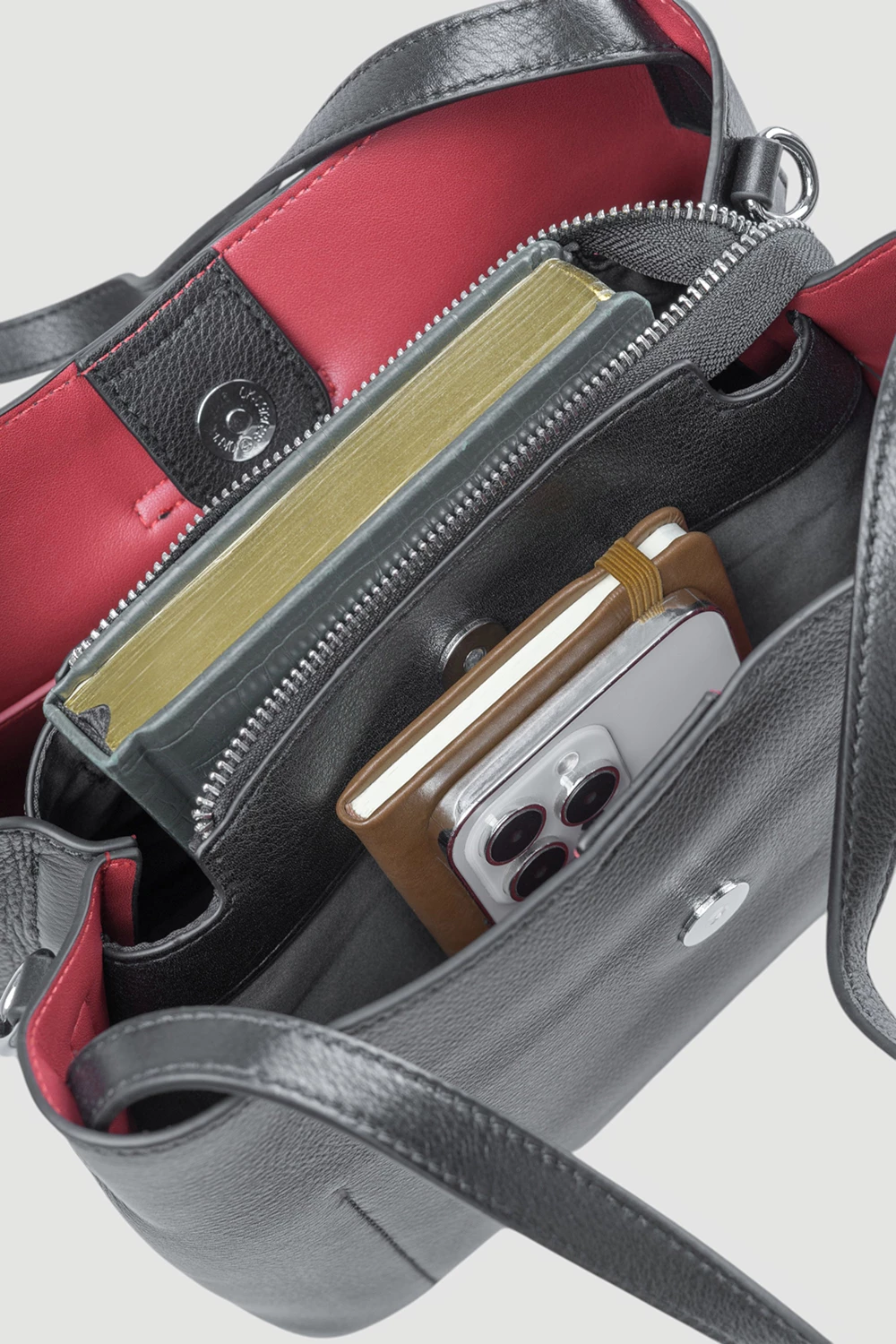 Классическая и универсальная сумка тоут черного цвета из натуральной кожи подчеркнет изысканный вкус и чувство стиля. Просторная внутренняя конструкция включает три отдельных отсека, центральный из которых оснащен надежной застежкой-молнией. Красная подкладка дополняется карманом на молнии. Сумка оснащена комфортным регулируемым ремешком.● магнитная застежка
