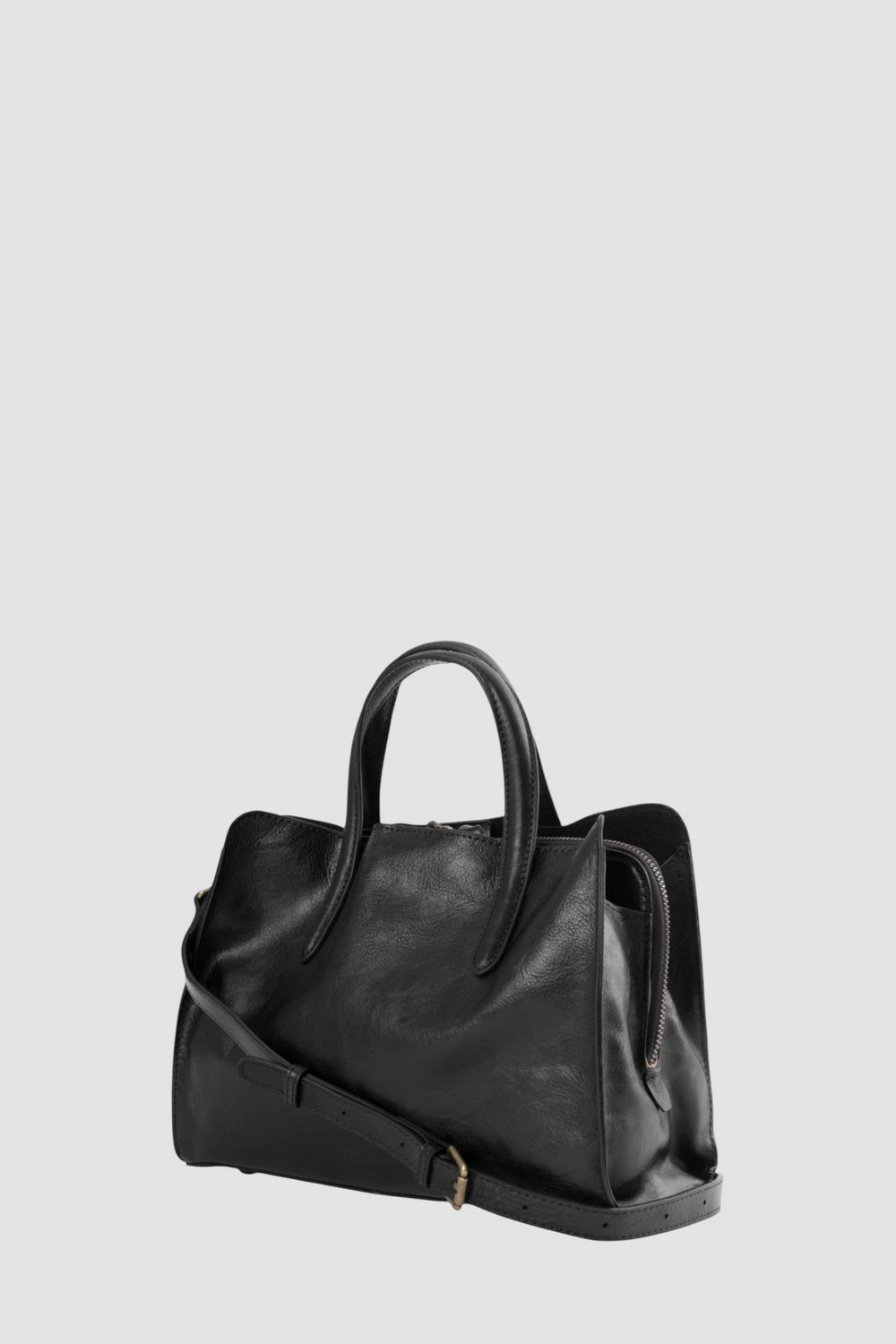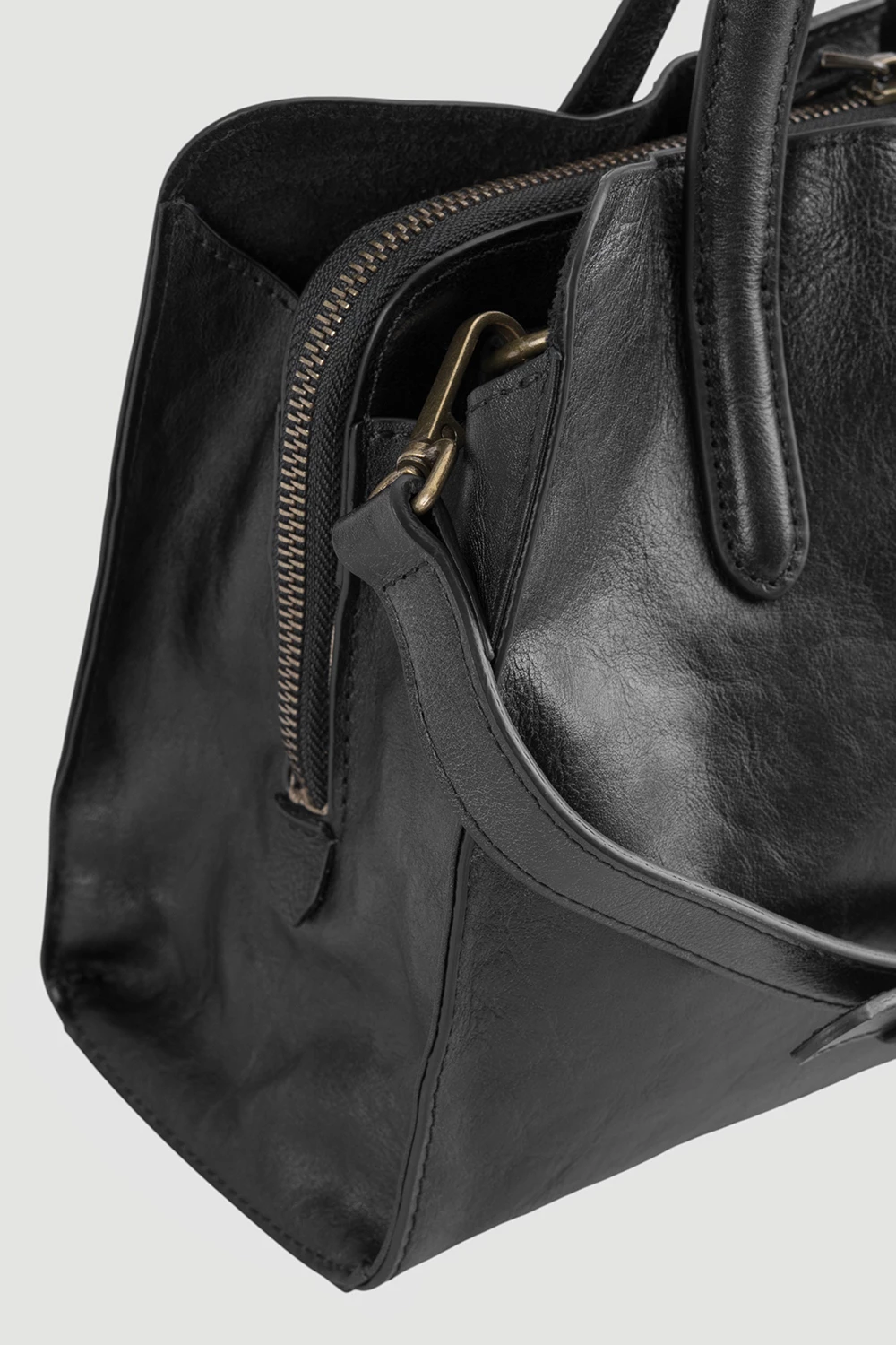 Классический черный тоут с тремя отделениями: два на кнопке и одно на молнии. Внутри два кармана — открытый и на молнии. Дополняет образ длинный регулируемый ремень. Практичный выбор для женщин, ценящих комфорт и элегантность.● 4 металлических ножки на дне