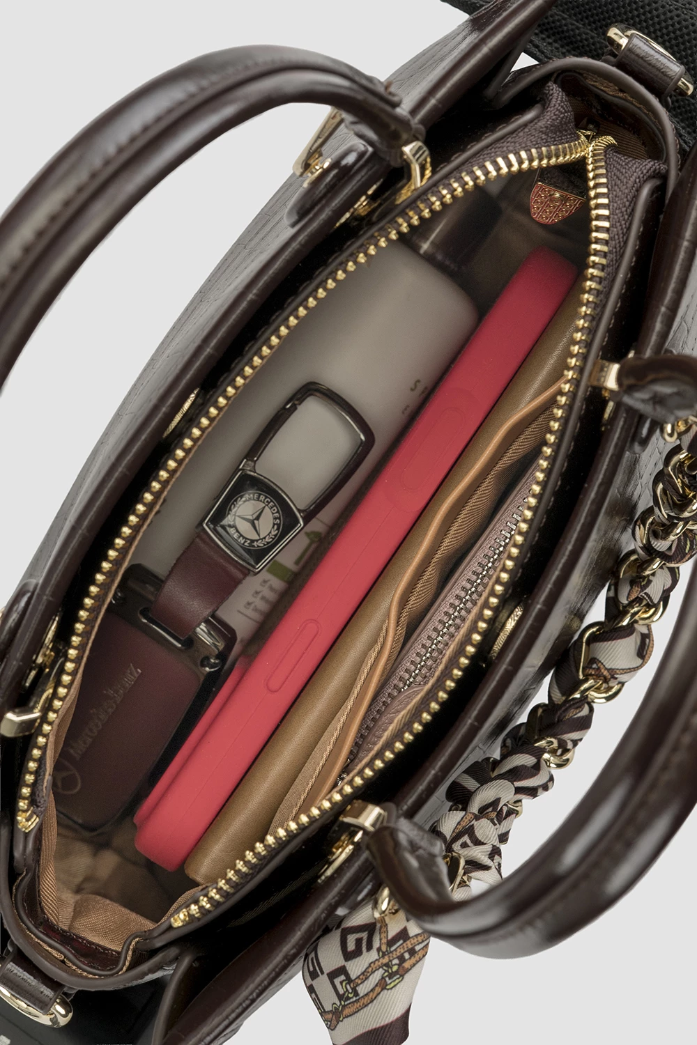 Стильная коричневая сумка-тоут из экокожи с элегантным тиснением. Внутри - карман на молнии для ценных вещей и открытый карман для удобства. В комплекте - декоративная цепочка и регулируемый ремень, чтобы носить как сумку или кросс-боди. Универсальный аксессуар для любого образа! ✨● модель для повседневной носки
