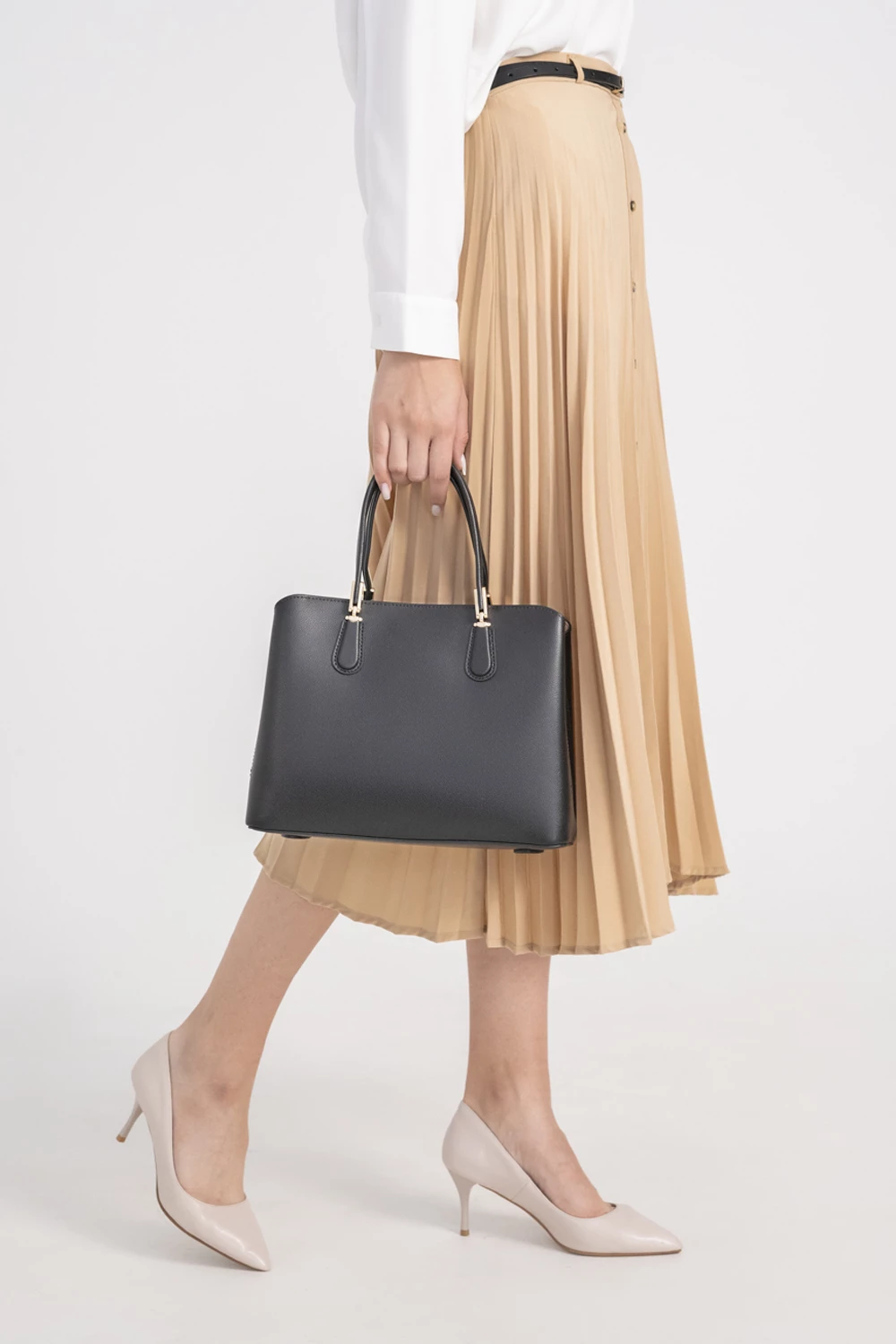 Представленная модель сумки уникальна, поскольку отлично сочетает в себе простоту и стиль без излишеств.Жесткий корпус прекрасно выдерживает форму, а ручки удобно размещаются в руке. Несомненным достоинством является один основной отдел, и два дополнительных — для книг, записных книжек, небольших папок, которые должны быть всегда под рукой.