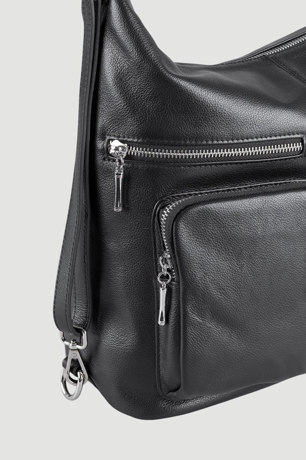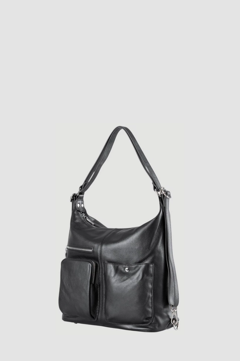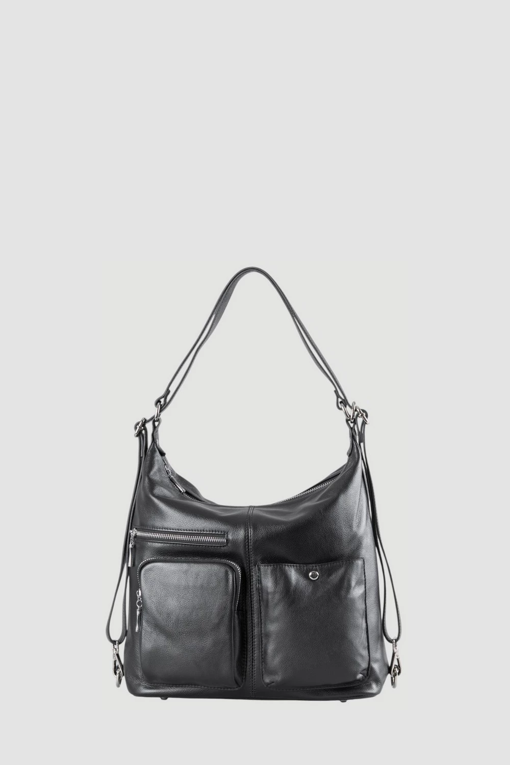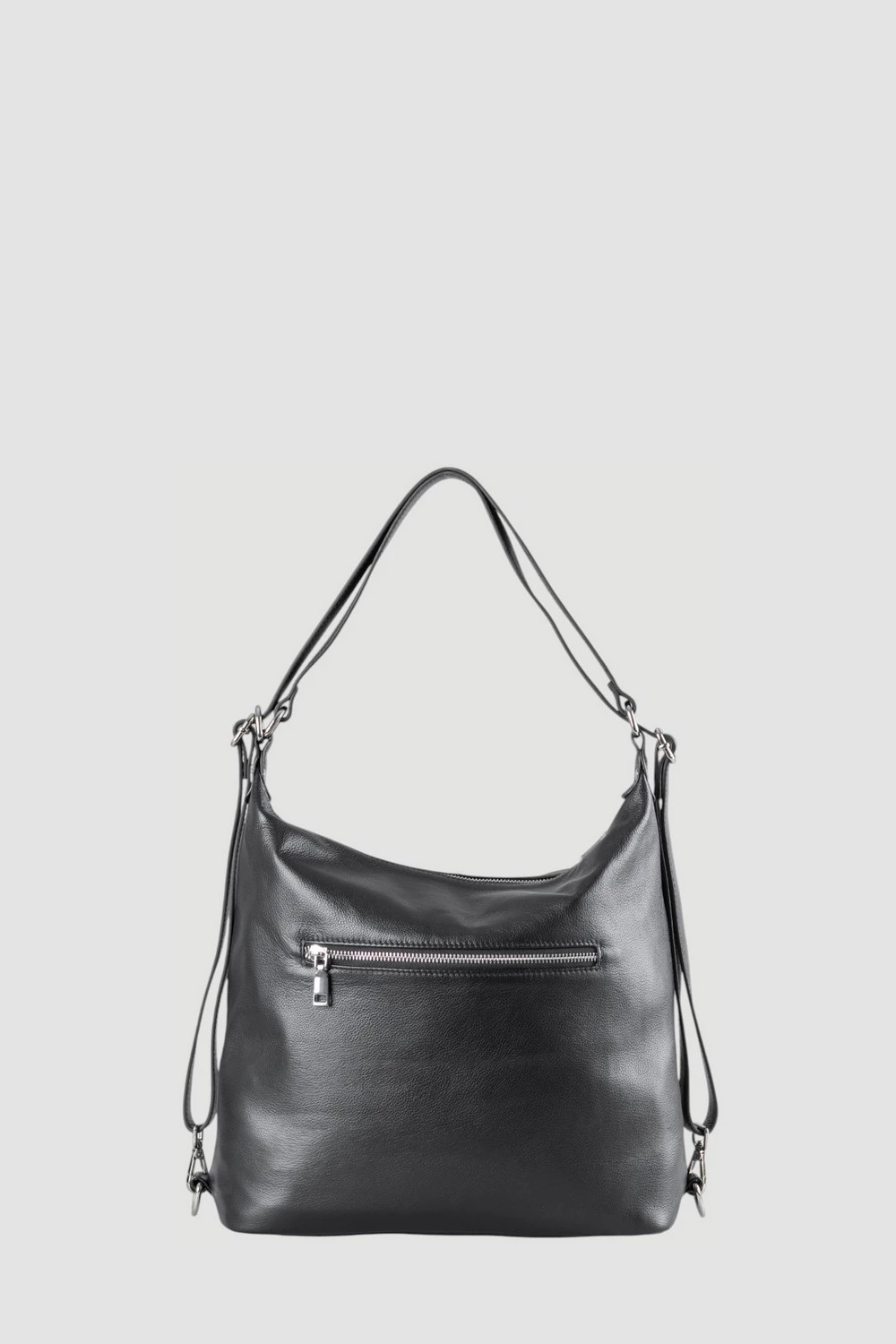 Черный кожаный рюкзак - трансформер из натуральной кожи. Необычная конструкция позволяет быстро превратить удобный рюкзак в классическую женскую сумку через плечо или ручную кладь. Глубокий черный цвет подходит к любому стилю одежды и к любому случаю. Просторное внутреннее отделение обеспечит идеальную организацию вещей.● натуральная фактурная кожа