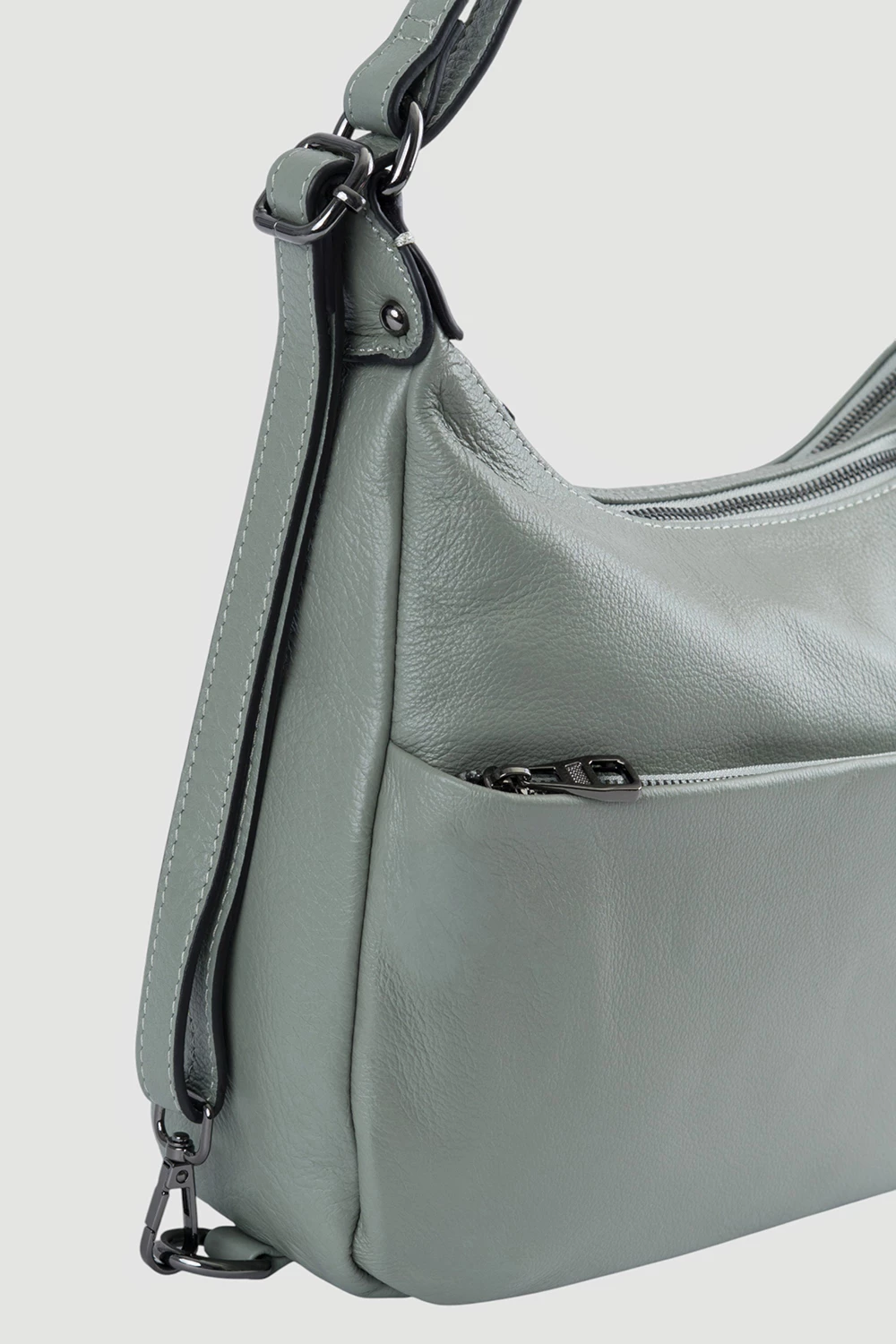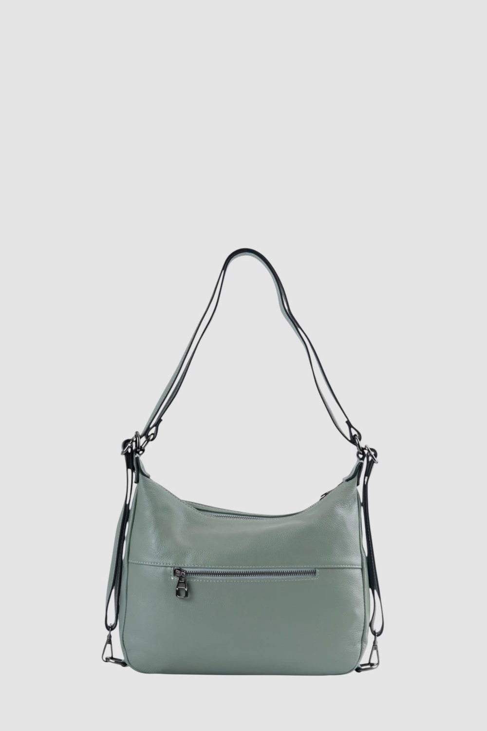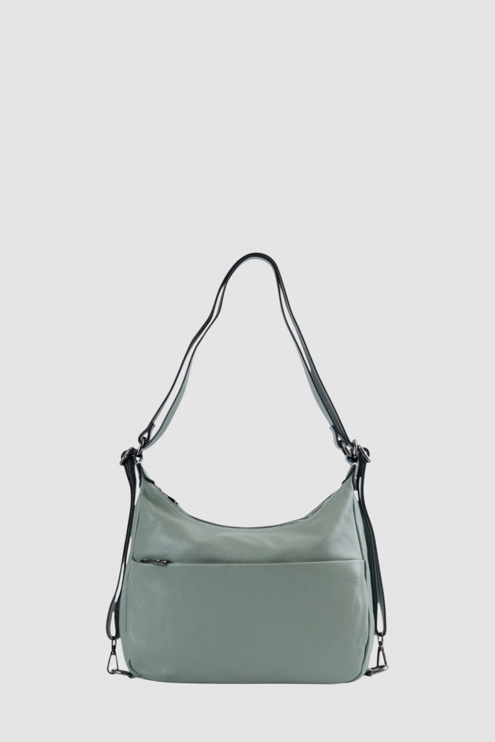 Зелёная сумка-трансформер с двумя отделами на молнии. Внутри предусмотрены два кармана: один закрытый на замок, другой открытый. Спереди расположен внешний карман, а сзади скрыт потайной на молнии для организации мелочей.● закрывается на молнию