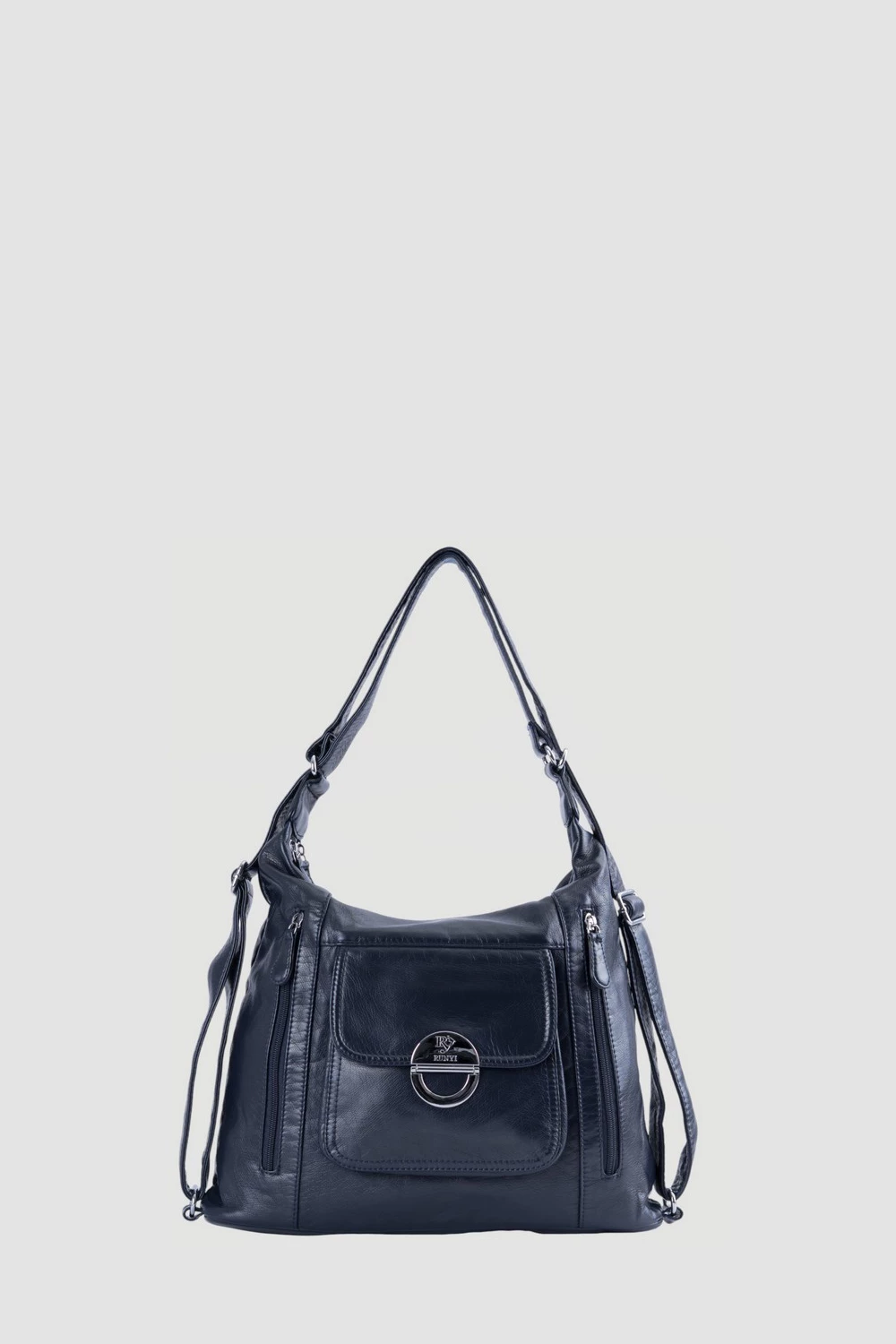 Темно-синяя сумка-рюкзак, оснащенная двумя большими отделениями на молниях. Во внутреннем пространстве каждого отделения предусмотрены два открытых кармана и один карман на молнии.Передняя часть рюкзака представлена двумя вместительными карманами на молниях и одним карманом на магнитной кнопке. Дополнительный карман на молнии расположен на задней поверхности для хранения мелочей.
