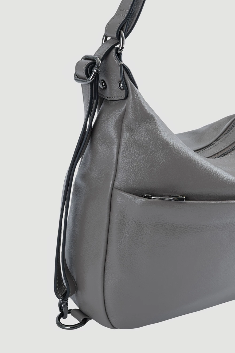 Серый трансформер с двумя отделами на молнии, внутри - карман на молнии и открытый карман. Спереди предусмотрен наружный карман, сзади - скрытый потайной на молнии для мелочей. Сумка универсальна и удобна в использовании.● закрывается на молнию